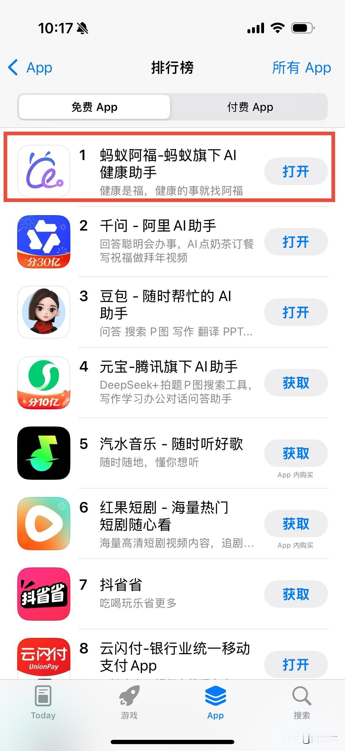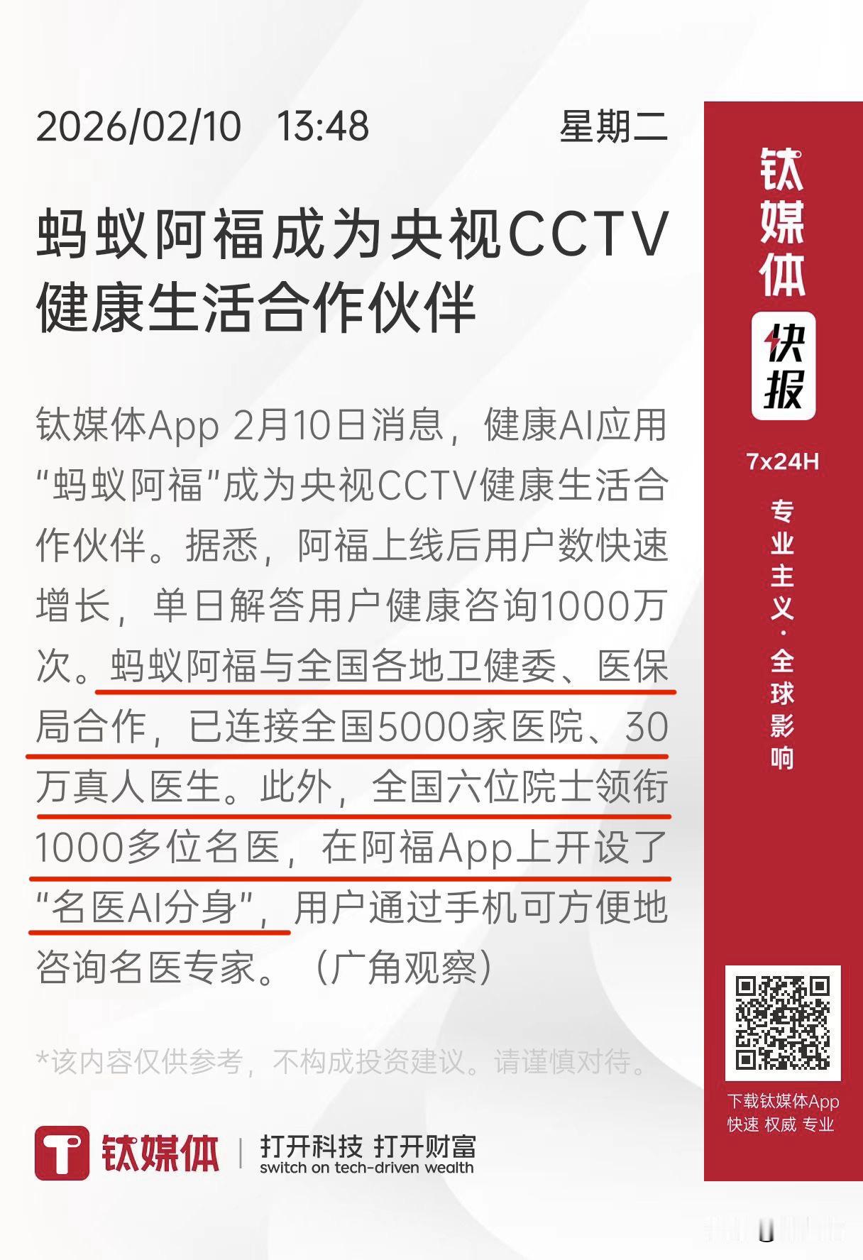 这次春晚,有个画面我印象挺深,阿福和豆包这两款AI应用居然登台了! AI软件能登上央视春晚这个大舞台,放在几年前谁敢想?但过去这一年,中国AI发展太快了,如今大人办公、孩子学习、甚至连老人都用上了AI,所以AI能上春晚,想想又觉得理所当然。 更有意思的是,关注软件下载榜单,会发现App Store免费榜前四名全被AI包揽,千问、豆包、阿福轮番登顶,挺给力的。而且各家还都上了春节活动,给用户送福利,其中蚂蚁阿福就很实在,本来除夕结束的福利活动,现在把新用户16.8元红包延到大年初七。 说到阿福,它能在这次AI热潮里跑出来,除了红包活动,更关键是选的赛道太符合大众期待,那就是健康领域。 这些年,健康成了头等大事。阿福聪明就聪明在,它在专业性下足了功夫,据公开信息,背后是200家大医院、1000多位名医参与共创,知识库含有海量医学文献,回答逻辑更像门诊大夫问诊,有个头疼脑热都能问。 还有一点很用心,其实老人健康咨询需求更大,阿福呢?贴心推出“长辈模式”,不光字够大,还能语音问、语音答,连不少方言也能听懂。 更关键是,阿福不是只提供分析,它还打通了医保卡,背后连接了5000多家医院和30万医生资源,真要就诊可以直接线上预约挂号,是不是很方便? 这次春晚后,会让更多人知道AI,也希望中国AI企业越来越好,让更多普通人享受到科技进步带来便利。