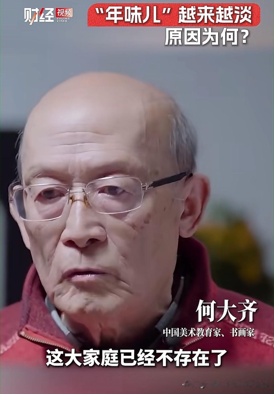 中国美术教育家、书画家何大齐直言年味淡是社会发展必然结果,不可抗拒的,无法改变的。一代人有一代人的年味,以后的年味可能跟平时没什么区别,年轻人可能已经“断亲”,他们的后代过年可能就宅在家里睡到年后…… 何大齐还称大家庭的分化,导致家族成员减少,大家族变成了小家庭,热闹减少了,很多形式都简化了。再者就是生活观念的变化,以前过年热闹非凡,疲于串门,忙于形式,现在是手机发个红包,一个视频电话就行了。年轻一代不爱折腾,是年味冲散的一个重要原因。 有一句话说得很好,人总是在无限接近幸福的时候最幸福。也就是过年前的回家,准备,期待,以及憧憬,才是年味最浓的时候,但很多人都忽视掉了,所以年味一直都在,就看我们如何无限接近它了。