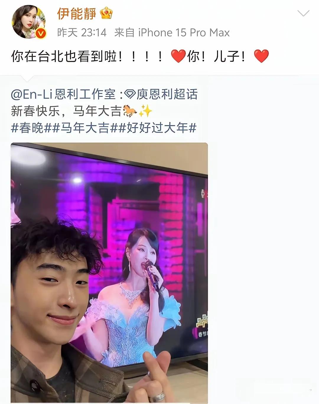 伊能静给所有女人上了一课,除夕夜,她的儿子庾恩利晒出一段视频,视频中的他正举着手与电视中的妈妈合影。 伊能静回复:爱你,儿子! 伊能静与苏有朋在春晚舞台上合唱《踏浪》,那么年轻漂亮,体态轻盈,在舞台上漫步走位如少女。 其实,今年伊能静已经快58岁了,即将到耳顺之年,状态居然这么好,儿子以妈妈为荣耀。 伊能静一袭浅蓝色美人鱼造型,发量惊人,头饰也非常少女感,都是海洋的颜色。 这样的母亲是孩子的骄傲。 虽然狗不嫌家贫,说儿不嫌女丑。 但是像伊能静这样自律,会保养也是一种尊重,以及对自己的取悦。 难怪秦昊被她迷得五迷三道,就连婆婆都把伊能静当成了闺女。 不过,恩利的眼里全是妈妈,好歹也让苏有朋露个脸。