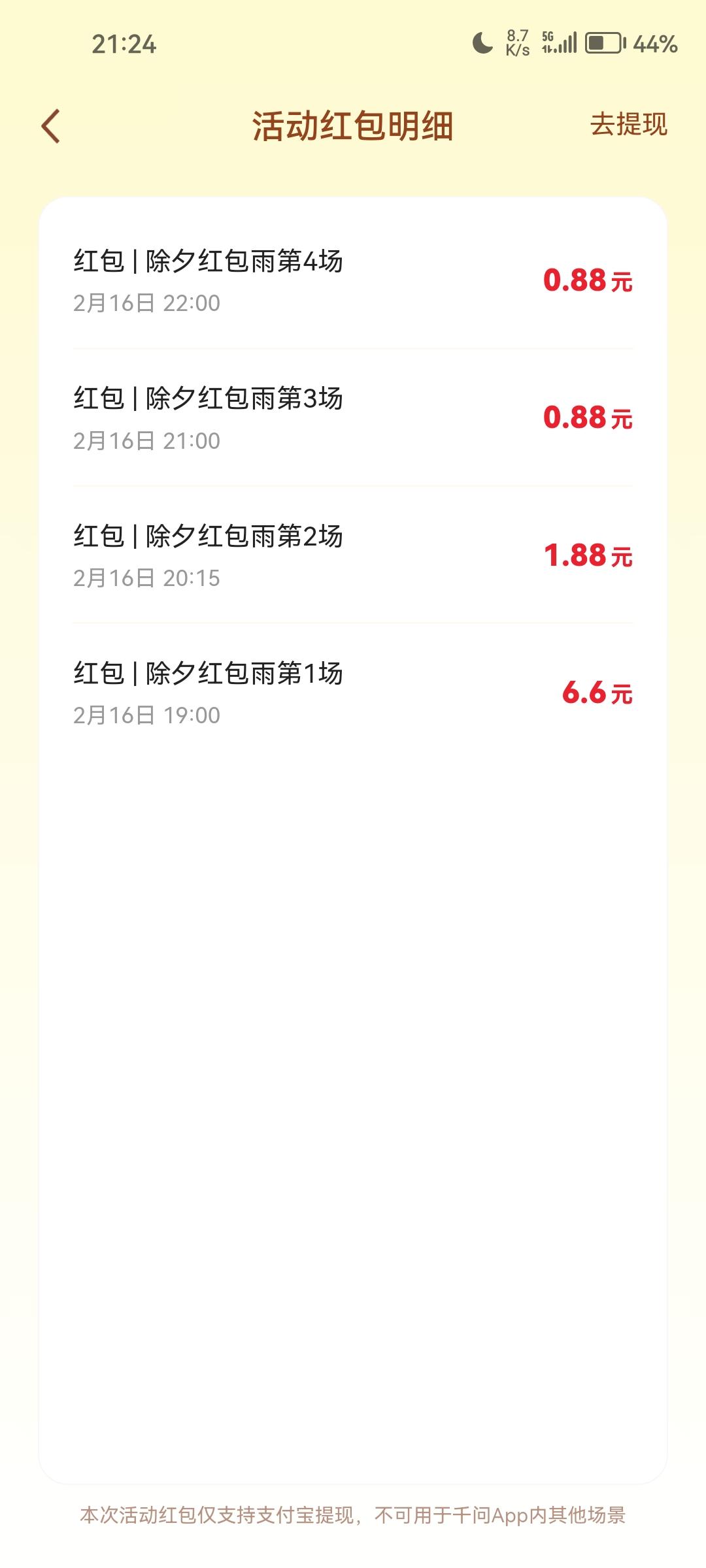 功夫不负有心人!除夕这一天,我耗时将近8小时,把各大平台APP的羊毛薅了个遍,共计拿下151元春节红包!战绩如下: 抖音集福加刷金币,两个账号一共斩获11.89元。豆包4场红包雨抢了四个红包,共计6.72元。抖音极速版春节红包加刷金币共计7.49元。字节系共计斩获26元。 支付宝集五福5.04元,蚂蚁阿福一次性给到16.8元春节线下消费红包。阿里千问APP更是大手笔,除夕四场红包雨共计斩获15.76元。除此之外,再给你一张25元超级免单卡。有效期直到4月30号才截止,时间自由诚意满满! 随后我又上网做了攻略,发现千问的超级免单卡竟然不限制你的身份。比如支付宝集五福,假如你一个人有两三个支付宝账号,但你只能集齐一个账号。但千问的超级免单卡,我一个身份证竟然领到了三张,总价值75元。不得不说,阿里实在太大气了! 然后是腾讯的元宝,给的不多,两个账号,一共才给了3块钱。还有快手和快手极速版。两个手机,两个账号。共计收入9.5元。 有一点还是要吐槽一下,就是快手集福卡的奖金给的太少了,只有5毛钱。抖音是1.08元,支付宝给的最多,每套福卡1.68元,轻轻松松就可以集齐三套。 总结一下。 阿里最大气!千问四场红包雨15.76元。三张超级免单卡价值75元。加上蚂蚁阿福16.8元,支付宝集五福5.04元。15.76+75+16.8+5.04=112.6元,再加上碰一碰支付红包,总收益不少于130元。 字节也不差,共计斩获26元。如果你春节有闲暇时间,刷一刷抖音极速版,抖音火山版,每天刷个3块5块的,还是轻轻松松。字节的特点就是APP矩阵比较强大,而且每个平台都能薅到羊毛。虽然每个APP给的都不算太多,但是加起来也很可观。 相比抖音,快手就寒酸多了。我两个账号两部手机。一个快手一个快手极速版,四个APP。一共进账才区区9.5元,不到10块钱。 最小气的就是腾讯的元宝了。两个手机一共就刷到2.99元,实在少的可怜!今天上午提现过后,气的我直接就把元宝全部卸载了。大过年的发点红包,一点诚意都没有,留你何用? 朋友们,你们除夕各平台羊毛都薅了多少?出来晒一晒啊,谈谈心得。