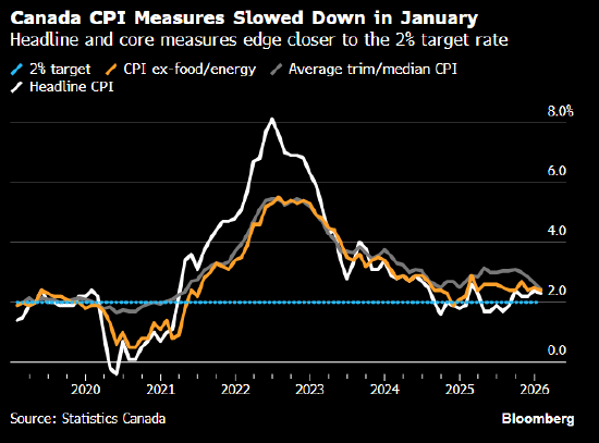 加拿大1月整体通胀率放缓至2.3%,低于经济学家预期的2.4%,主要因汽油价格同比下降。
