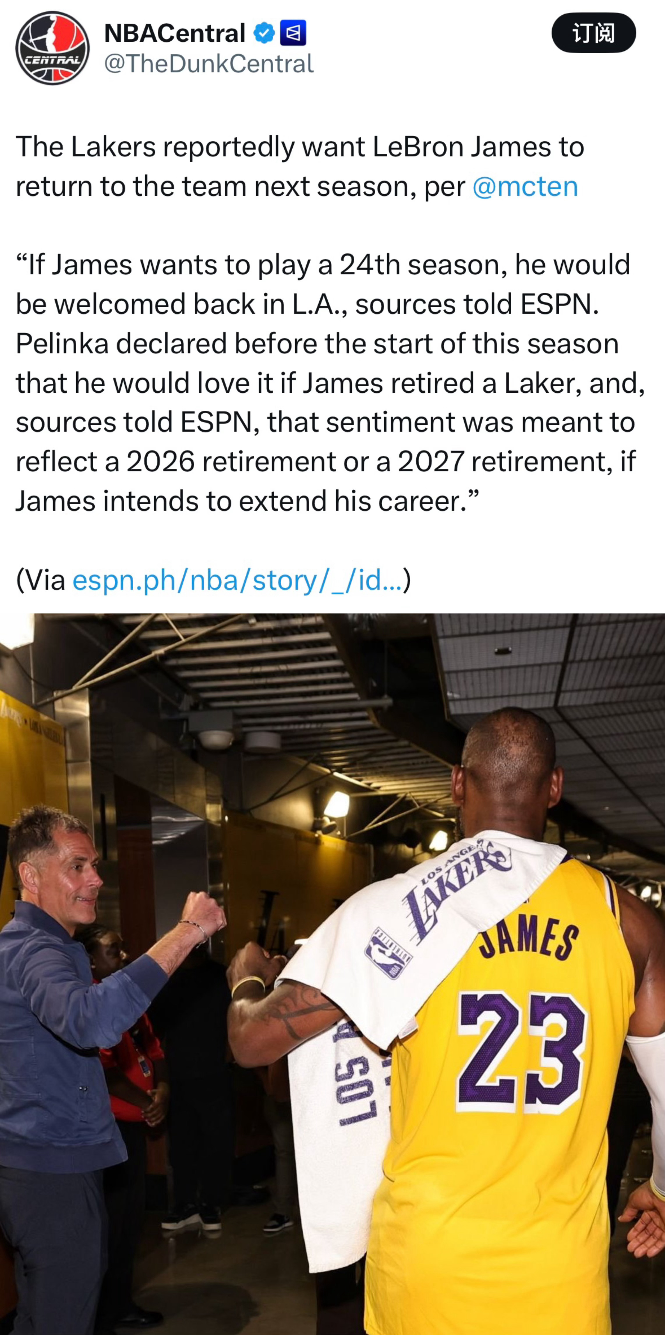 消息人士向ESPN透露:“如果詹姆斯希望征战第24个赛季,湖人会欢迎他回归。”