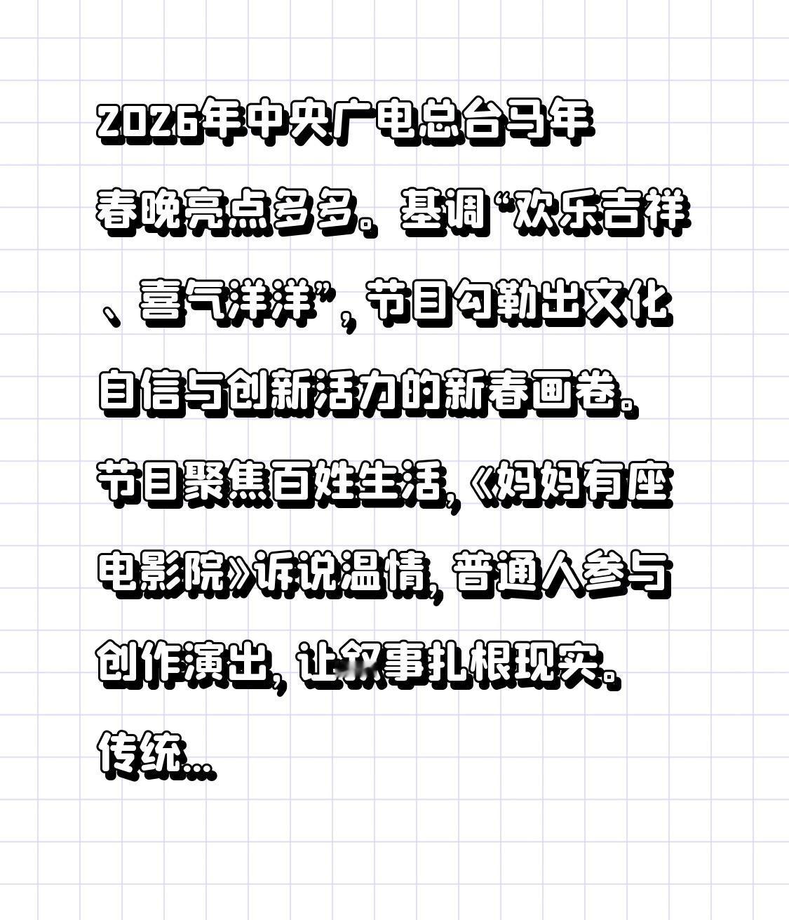 2026年中央广电总台马年春晚亮点多多。基调“欢乐吉祥、喜气洋洋”,节目勾勒出文化自信与创新活力的新春画卷。 节目聚焦百姓生活,《妈妈有座电影院》诉说温情,普通人参与创作演出,让叙事扎根现实。传统文化也被创新演绎,《贺花神》打造沉浸式视觉盛景,《吉量》等节目融合多种元素。 技术更是一大亮点,首次实现8K超高清制播全链路国产化,AIGC技术大规模应用,如《驭风歌》让《六骏图》动态呈现2026春节档
