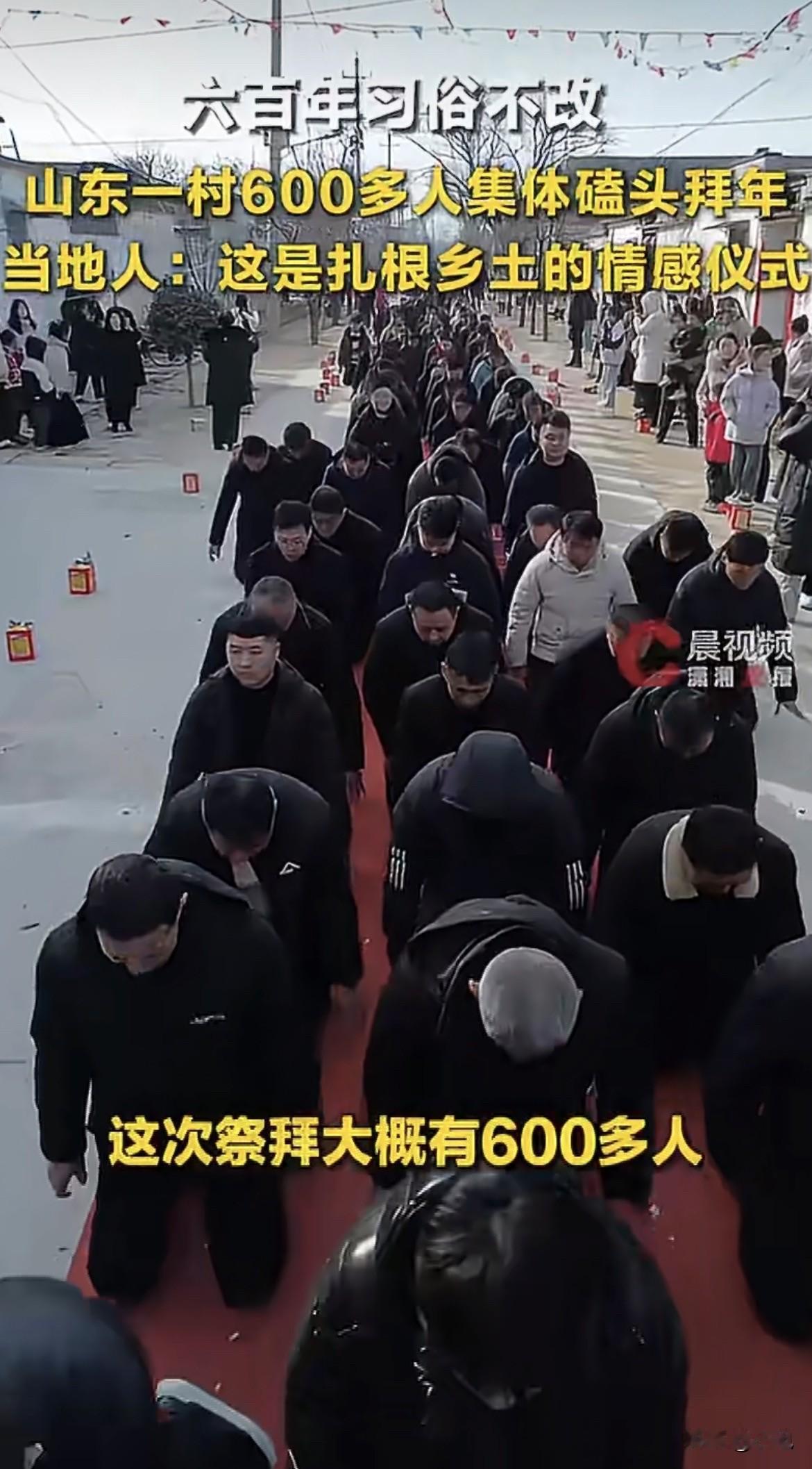 绝了,六百多人集体下跪磕头? 山东聊城一个村子,大年初一天还没亮透,雷氏祠堂门口就黑压压站满了人。 六百多个雷姓族人,按辈分排好队,老的站在前头,小的跟在后边。 队伍从祠堂门口一直排出去,弯弯曲曲拖了上百米。 天冷,人人嘴里呼着白气,但没有一个人说话,全安安静静等着。 带头的长辈喊了一声,开始。 六百多人齐刷刷跪下,冲祠堂里的祖先牌位磕头。 一个头,两个头,三个头。 动作整齐得跟排练过似的。 磕完祠堂里的,队伍开始往外走。 挨家挨户,给村里的长辈拜年。 每走到一户人家门口,领头的喊一嗓子:给长辈拜年了。 后边呼啦啦跪倒一片。 长辈站在门口,脸上笑着,嘴上说着使不得使不得,身子却一动不动地受了这个礼。 等众人起来,长辈赶紧上前,往领头的人手里塞红包,再抓一把糖果花生,往人群里撒。 孩子们哄笑着抢,老人们站在旁边看着,笑得眼睛眯成一条缝。 就这么一家一家走,一家一家跪。 从凌晨一直磕到天光大亮。 这事发到网上,评论区直接炸了锅。 有人说,这是封建糟粕,都什么年代了还磕头。 有人说,理解不了,跪天跪地跪父母,给七大姑八大姨跪什么跪。 还有人说,看着跟出殡似的,瘆得慌。 但当地人不这么看。 一个雷家的媳妇说,这个习俗在他们村传了六百多年了,从明朝那会儿就有了。 六百多年,朝代换了多少茬,外面的世界变了多少回,但这个村子里的这个仪式,一直没断过。 每年大年初一,在外头打工的、做生意的、上学的,不管多远都得赶回来。 不为别的,就为跟着队伍,给长辈磕这三个头。 有人问,那在外头回不来的咋办? 回不来的,家里的长辈就替他们磕。反正雷家的人,一个都不能少。 这个仪式有个规矩,女性不进祠堂。 男人们去祠堂磕头的时候,女人们就在家里等着。 等男人们磕完回来,女人们再结队出门,给村里的长辈拜年。 她们不磕头,但会拉着长辈的手,坐下来聊会儿天,问问身体,说说家常。 这是她们的拜年方式。 有人说这不公平,凭什么女人不能进祠堂。 也有人替她们说话,说分工不同罢了,男人跪祖宗,女人暖人心,各有各的位置。 争论归争论,但村里人自己不在意这个。 他们在意的是另一件事。 六百多人跪下去的那一刻,所有人心里都清楚,这些人跟自己流着一样的血。 那个在外头当大老板的,小时候跟自己一起光着屁股下河摸鱼。 那个在城里教书的,过年回来也得老老实实跪在泥地里。 那个嫁出去几十年的姑姑,每年这天都得回村,站在人群里看着自家兄弟磕头。 这叫啥? 这叫根。 有个细节挺有意思。 队伍走到一家门口,那家的长辈是个八十多岁的老太太,腿脚不好,出不了门。 众人跪在院子里磕头,老太太就趴在窗户上往外看。 等磕完了,老太太让儿媳妇把窗户推开,冲外头喊:都起来吧,地上凉,进屋暖和暖和。 没人进去。 队伍已经往下一家走了。 老太太就趴在窗户上,一直看着队伍走远。 另一个细节。 队伍里有个小伙子,去年刚考上大学,头一回跟着磕头。 磕完头起来,膝盖上沾了两块泥。 他低头看了一眼,没拍。 旁边他爹看见了,也没说啥。 爷俩就穿着带泥的裤子,跟着队伍往下走。 网上吵得凶的那些话,什么尊严、什么平等、什么封建,在这个村子里,好像都不存在。 对他们来说,这就是过年。 就像年夜饭要吃饺子,三十晚上要守岁,大年初一就要磕头。 没有为什么,从小就这么过的。 那些说这是陋习的人,大概没法理解。 当你跟着六百多个姓雷的人一起跪下去的时候,你心里想的不是屈辱,也不是服从。 你想的是,这六百多个人里头,有你的爷爷,有你的爸爸,有你的兄弟,有你的侄子。 你跪的也不是哪个人,是这个家族六百多年的香火。 站起来的时候,你是这个家族的一份子。 走再远,这个头磕过了,你就知道自己从哪儿来。 六百多年,就是这么一年一年磕过来的。 你们那儿过年,还有这样的老规矩吗?