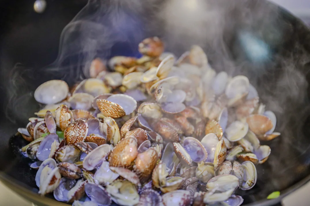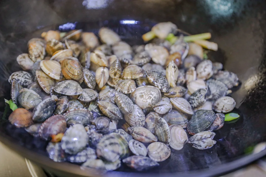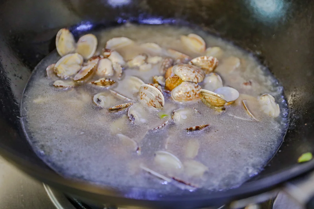 ✨3.锅里烧油,加入葱姜炒香,加入蛤蜊,来回翻炒几下,盖上盖子,大火焖上3-4分钟,等到蛤蜊全部开口即可。