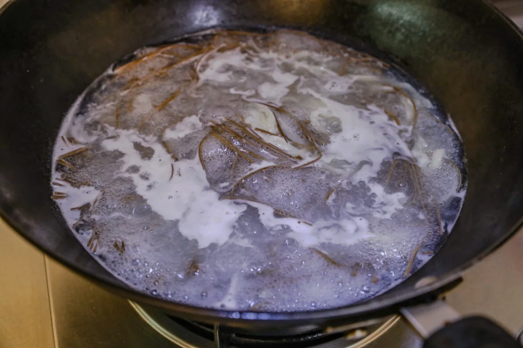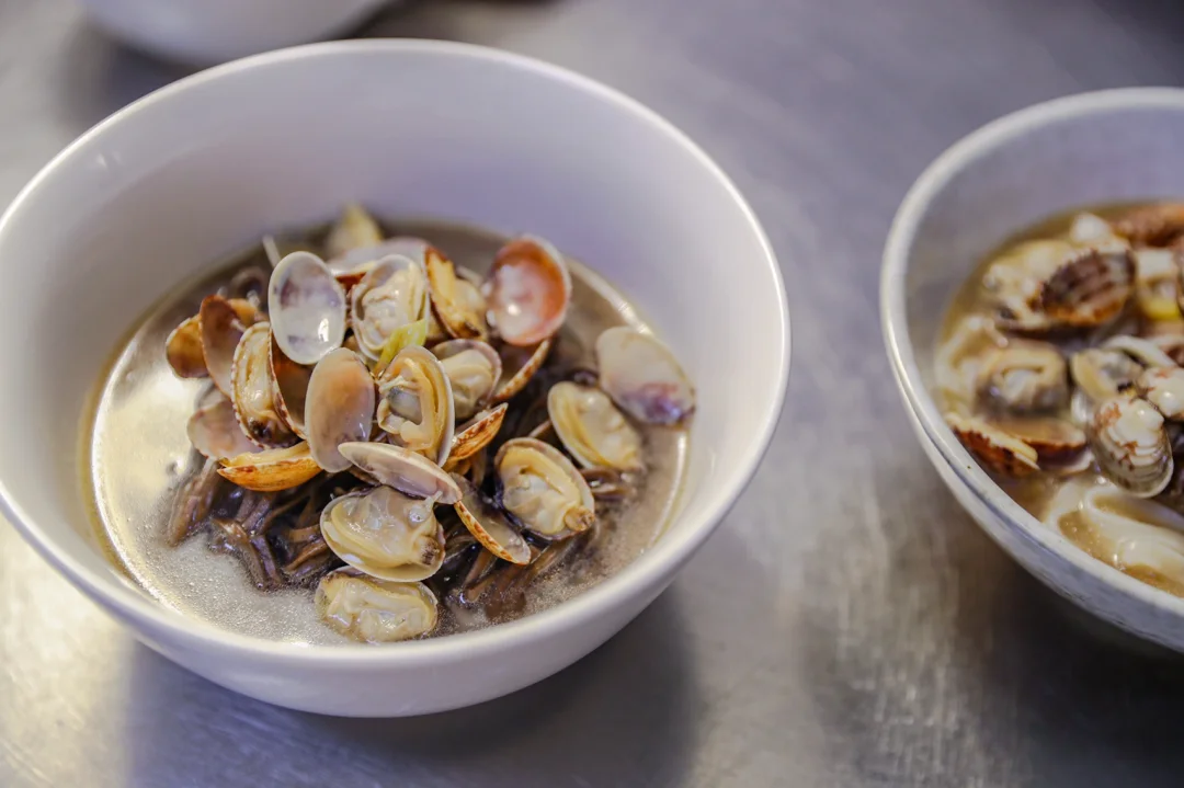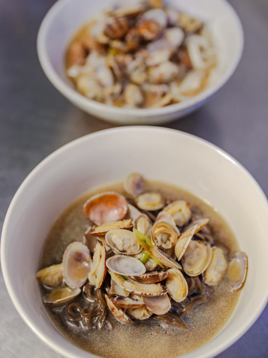 ✨4.盛出来一部分蛤蜊可以当作一道菜肴单独享用。剩下的汤头和蛤蜊中可以再放入一些热水,加入一点生抽和黄酒,如果不排斥韭菜可以放一些。再次滚开关火即可。无需添加任何食盐哈~
