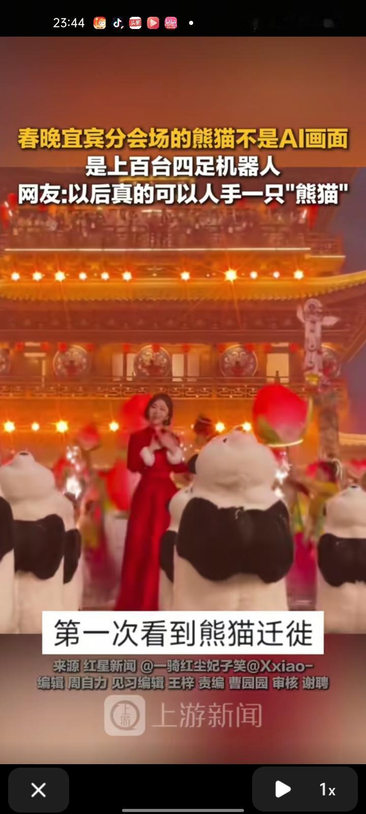 2月17日(报道),四川宜宾。央视春晚宜宾分会场中,上百只憨态可掬的“熊猫”列队穿梭,可爱互动,让人印象深刻。这些画面不是AI特效,而是百台四足机器人的精准协同表演。有网友称,以后真的可以人手一只“熊猫”。