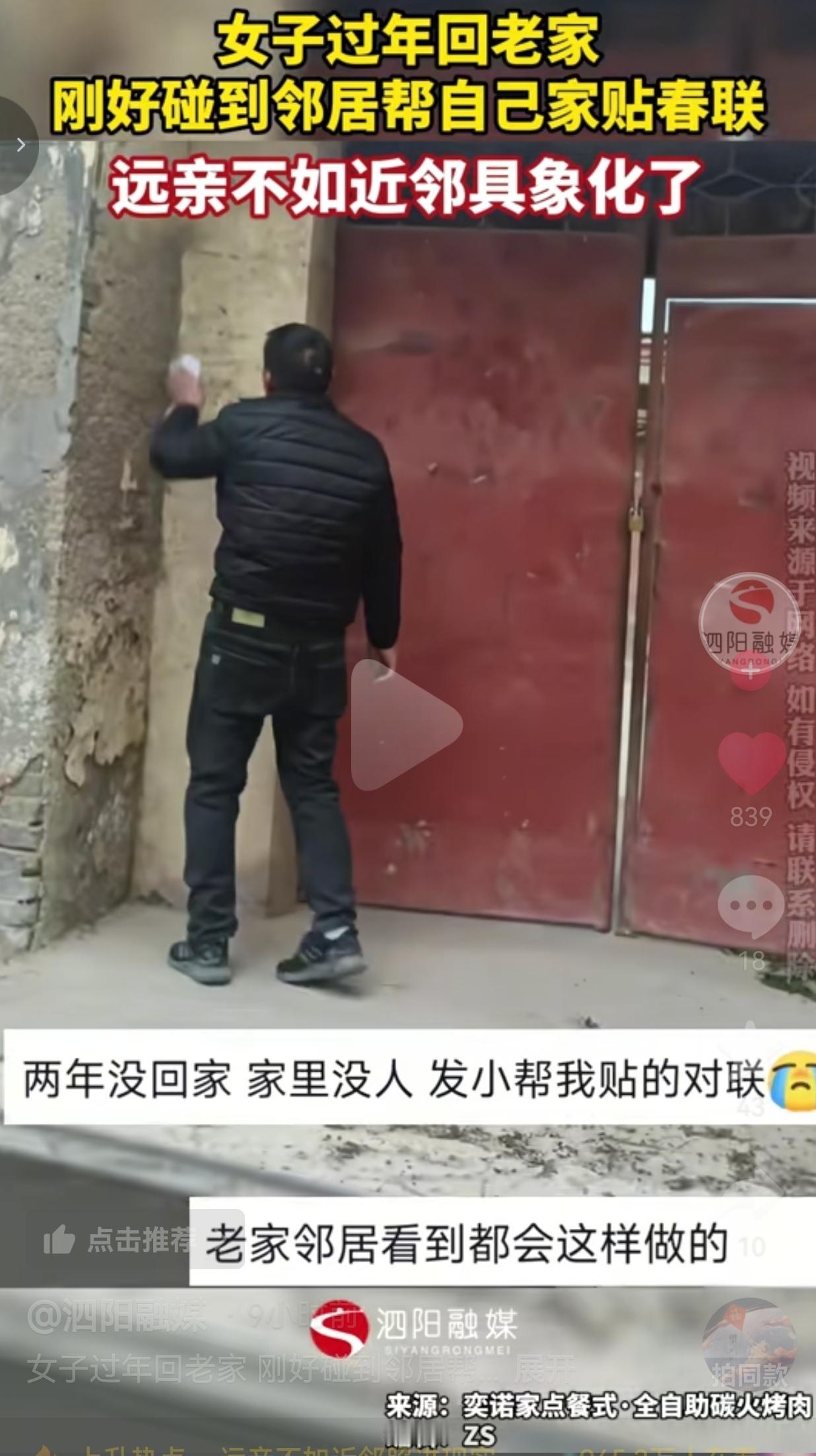远亲不如近邻真的具象化了!除夕当天,女子结束自己的工作,开着车,踏上了回家的征程,不久之后,她终于回到了那个两年没踏足的小院。 车刚停稳,眼睛往外面一瞥,就看见隔壁王哥的背影。只见他穿着那件洗得发白的黑棉袄,正踮着脚,往她家大门上贴春联。手里的浆糊还冒着白气,他冻得通红的手,一下一下把春联捋得平平整整。 她喊了一声“王哥”,他回头冲她笑,露出一口白牙:“丫头,可算回来了!知道你今年肯定回,我就提前把对联给你贴上了,图个吉利!” 她站在原地,鼻子一酸,眼泪差点掉下来。 这两年,她在南方打工,赶上疫情,又赶上项目忙,连过年都没敢回来。 由于,家里没有人,长时间不开门,家里的门锁都快锈了,院子里的草长到了膝盖。她以为,这个年,她家的大门又要冷冷清清地关着了。 可王哥说:“你不在家,我们这些老街坊,就是你家的看门的。” 此事传到了网上,引发网友的热议,有的网友说:“我家在东北,我在深圳打工,每年过年,都是楼下张叔帮我家贴春联,放一挂小鞭炮。” 也有的网友说: “我妈去世早,我爸一个人在家,每次我打电话,都是对门李婶接的,说你爸在我家吃饺子呢。” 还有的网友说:“远亲不如近邻,这句话,只有在你最需要的时候,才知道有多沉。”  其实,像王哥这样的邻居,在老家真的太多了。 前几天刷到个视频,也是安徽的一个姑娘,两年没回家,推开大门,看见发小正帮她贴春联。姑娘在视频里哭着说:“我以为我家的年,早就没人过了。” 大家总说,现在的年味儿越来越淡了。可年味儿,从来都不是大鱼大肉,也不是红包鞭炮。 年味儿,是你不在家,有人帮你把家门守着。你回来了,有人端着一碗热饺子过来。如果你遇到难处,有人二话不说就伸手。 它藏在邻居递过来的一把葱里,藏在深夜里帮你照看孩子的一句“放心去吧”里,藏在你家没人时,帮你扫雪、贴春联的背影里。  可我们这代人,好像越来越忘了“邻居”这两个字的重量。 我们搬进了高楼,关上了防盗门,对门住了三年,不知道对方叫什么名字。我们在网上和陌生人掏心掏肺,却对楼下帮你捡过快递的阿姨,连句谢谢都懒得说。 我们总说“人情淡薄”,可我们自己,又为这份人情,做过什么呢? 那一刻,她突然明白:年,从来都不是一个日子,而是一群人。 家,也从来都不是一个房子,而是有人在等你。 我们总在远方追逐梦想,以为成功了,就拥有了一切。可到最后才发现,最珍贵的,从来都不是那些遥不可及的东西,而是身边那些最朴素的温暖。  大家觉得呢?欢迎大家评论区讨论留言。