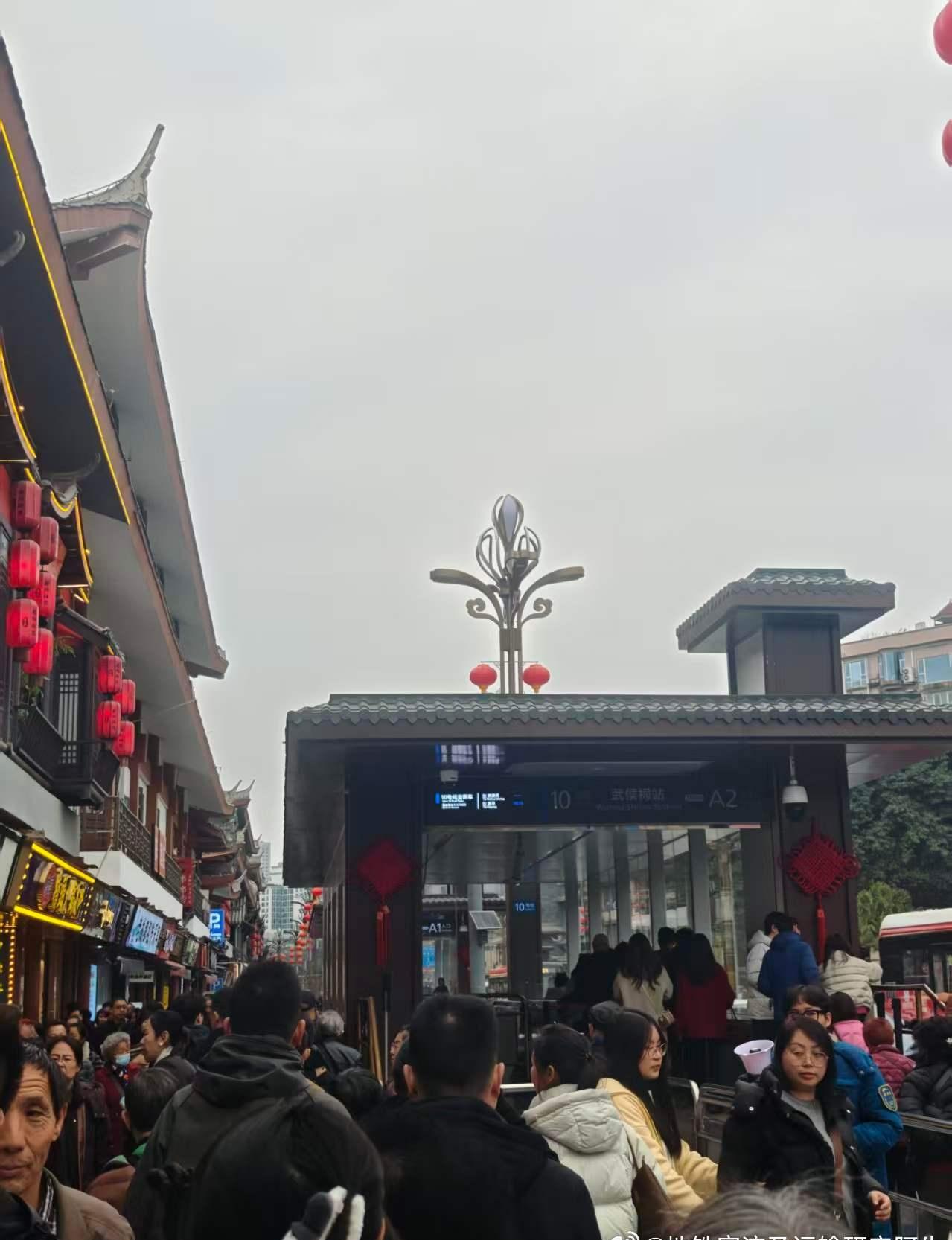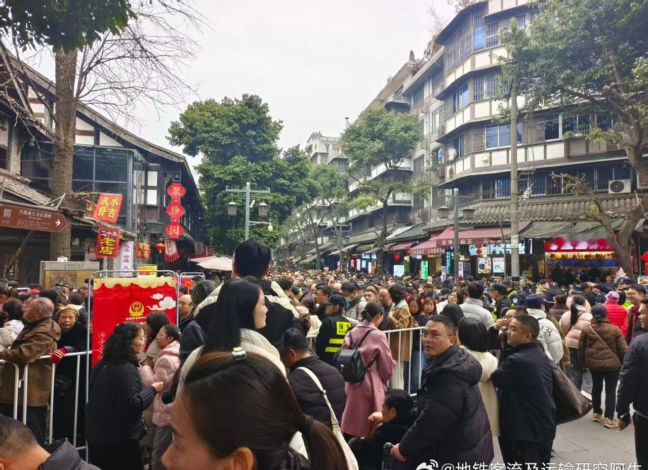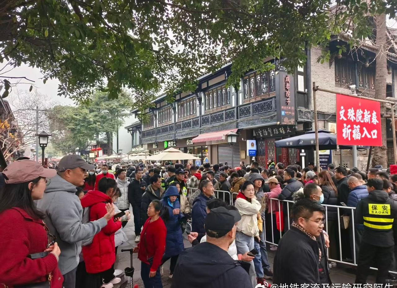 网友:2026-02-17(大年初一正月初一 ),今日大年初一,天气阴,成都各景区和商业中心客流较多,成都地铁10号线武侯祠A2口因客流太大,只进不出,可惜10号线北边断头,还差一站和13,差两站2/17换乘。不晓得比去年初一能多多少客流。 P1-2,文殊院上香客流。P3,武侯祠A2口,视频,高升桥站(3/5/10号线)换乘客流。