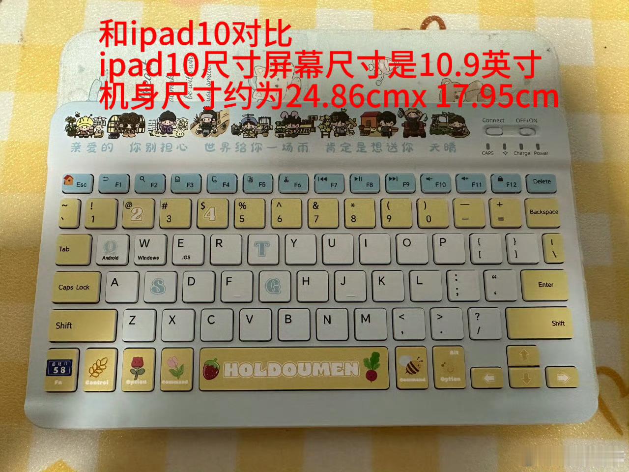 蓝牙键盘大小大家可以先参考我这个用下来的感觉:日常打字很OK!因为我这个是充电款我从buy回来到现在一次电都没充过我去年7月份买的,连ipad很方便手机也可以连接,打字声音也不大,个人感觉蓝牙键盘很OK