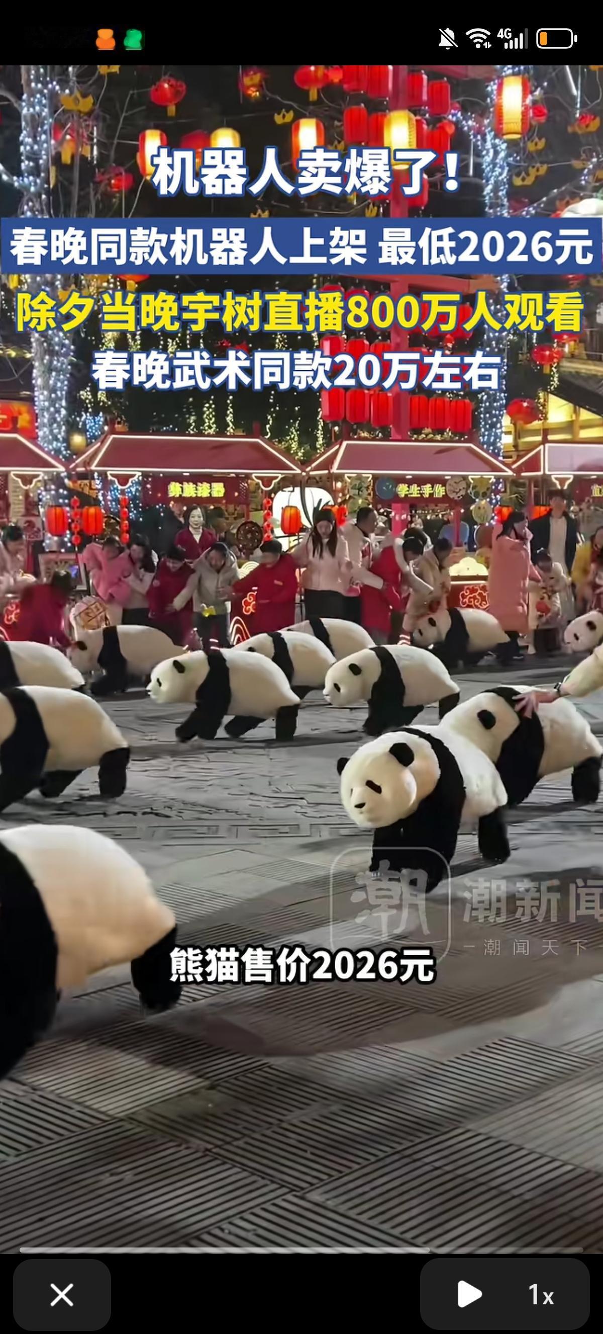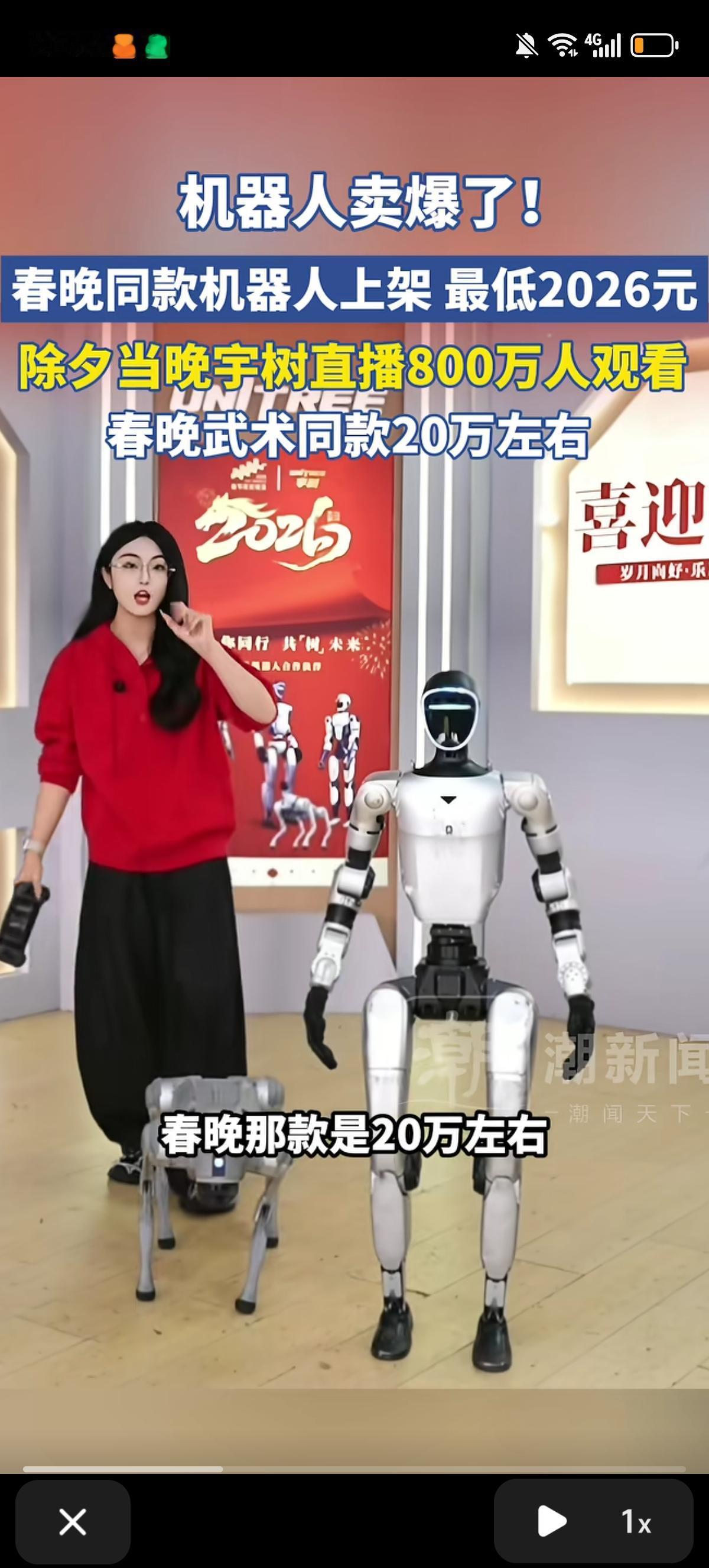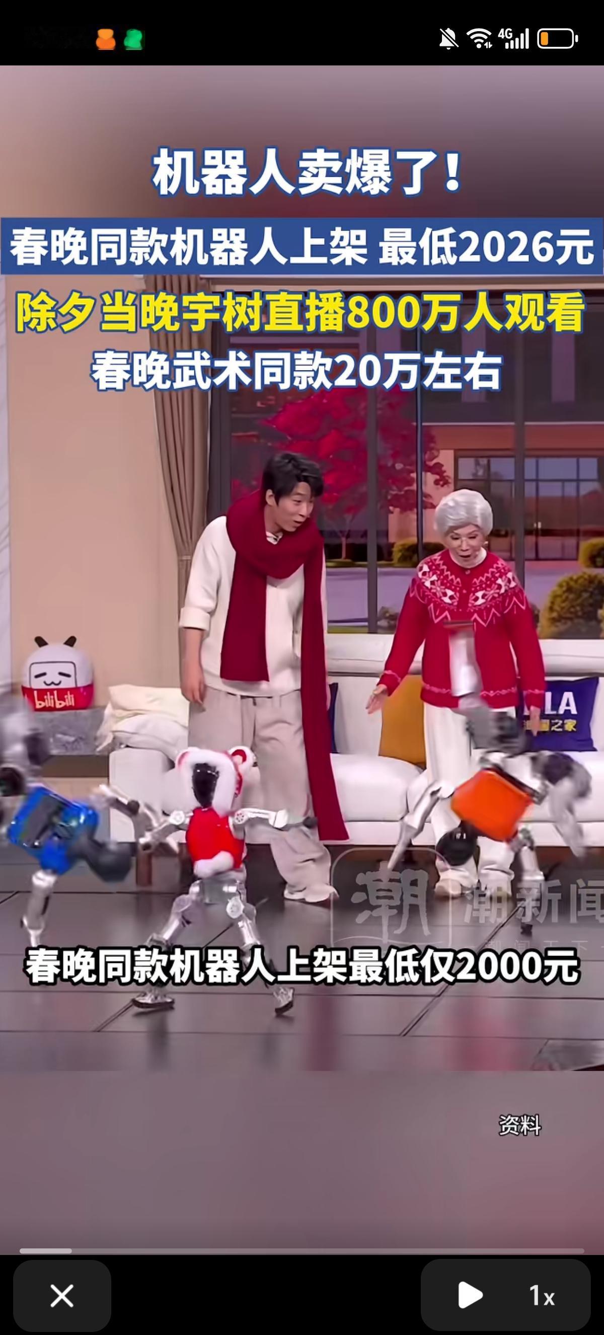 我感觉蔡明和王天放这回演的小品《奶奶的最爱》挺好看的啊,充分展示了人和机器人的和谐相处,广告部分很丝滑,一点不生硬,让人看的津津有味的,尤其是蔡明那句:“豆包豆包,这是个什么东东?”。 豆包答:“这是个孙子,真孙子”。 感觉好搞笑啊,我从头看到尾了,一点没有不耐烦。还有人说“黄渤怎么年轻了?” 还有蔡明和机器人奶奶说“让你一个人老家辛苦你了”。 机器人奶奶回答“不辛苦,竟骂你孙子了”。 都充分展现了机器人的魅力,太好看了有没有。 据说这回机器人都卖爆了,那个机器大熊猫机器人才2026元就能拿下,刚上架就售罄了。宇树春晚同款机器人售价207805元,上架几分钟就被抢空了,支持送货上门,但不支持7天无理由退货。 会跑步的小布米售价9998元。会空翻的“小顽童N2”春晚同款售价69900元。能“伸脖子”的E1售价79900元。银河通用当晚近300台连夜加购。 京东等平台在除夕当晚10点上架“春晚同款”机器人,几分钟内多个品牌产品被抢购一空。 多家机器人厂商订单量增长超150%,部分品牌连夜加购生产,工厂加班赶工仍供不应求。