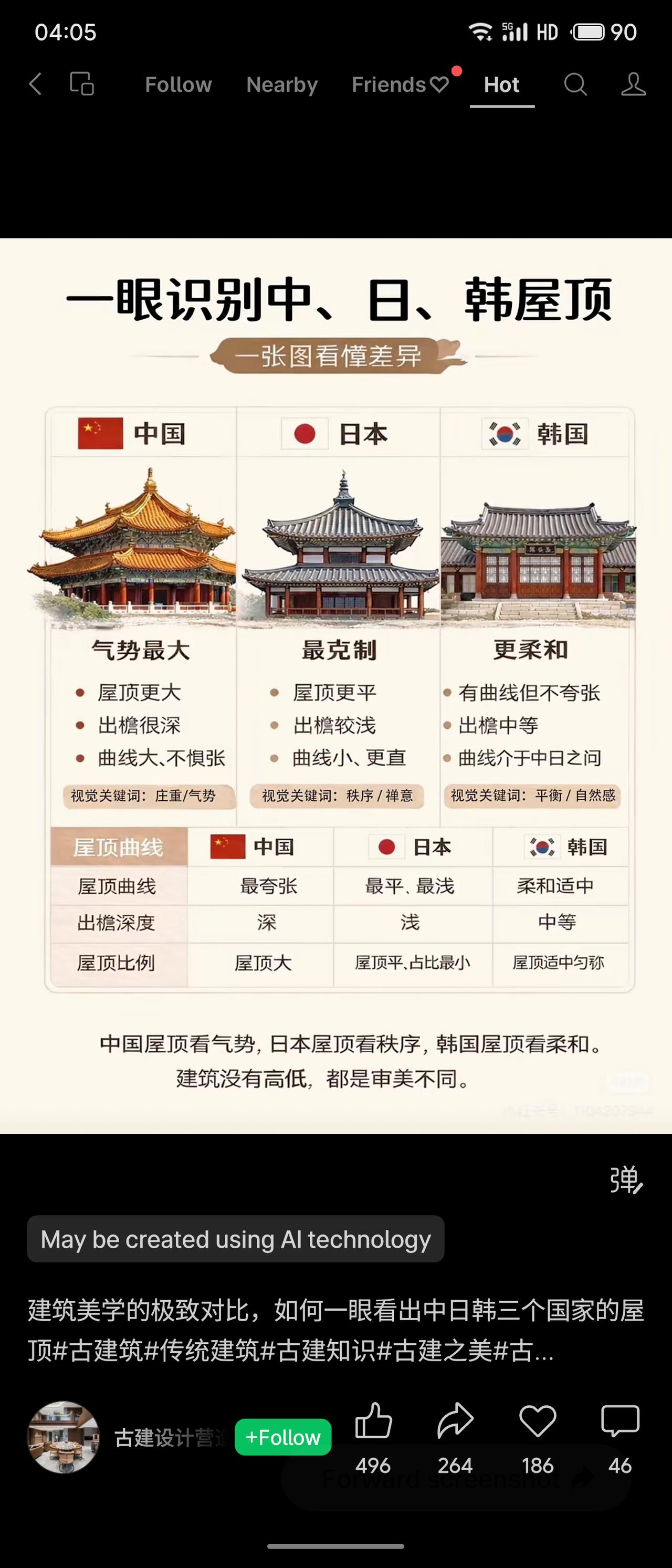 组图文直观对比了中日韩传统屋顶的建筑美学:中国屋顶曲线夸张、出檐深远,彰显恢弘气势;日本屋顶线条平直、轮廓克制,体现禅意秩序;韩国屋顶曲线柔和、比例适中,呈现平衡自然之美。对比并非为分高下,而是帮观者读懂不同民族在审美哲学上的独特表达——从张扬到内敛,从气势到秩序,屋檐之上镌刻着文化的基因。