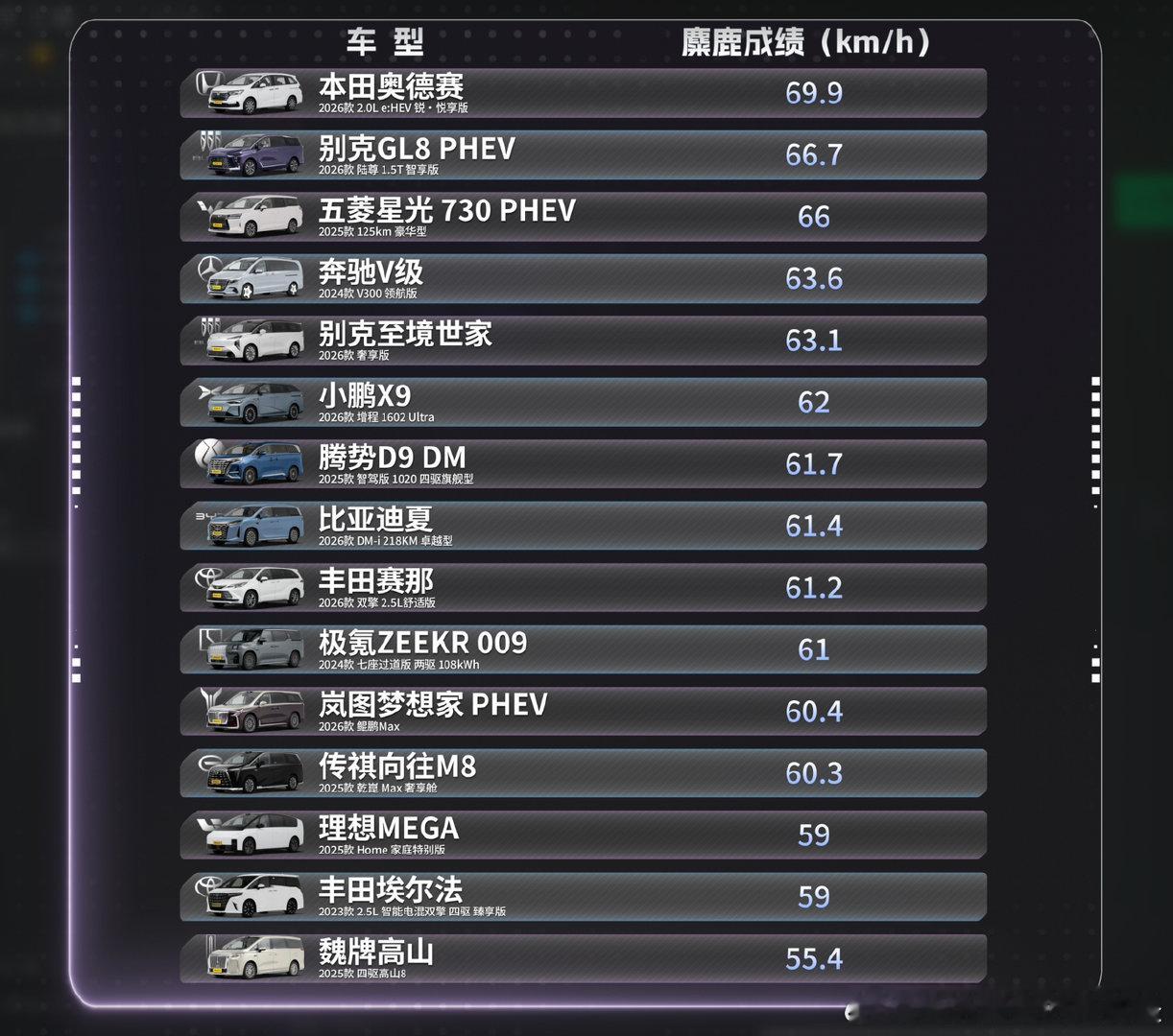 聚焦当下最受关注的家用与商务MPV车型,从真实用车场景出发,带来专业、客观、深度的全维度解读,想知道这些MPV的全部表现,完整视频已在懂车帝独家上线,一定能给你的选购提供实际帮助。在考验车辆紧急避险能力的麋鹿测试环节,本田奥德赛以69.9km/h夺冠,五菱星光730 PHEV以66km/h成黑马,超越多款高价车型。加速性能上,理想MEGA凭借5.95秒的零百加速成绩,成为全场唯一突破6秒大关的车型。制动环节则呈现出反常识的结果,车身最轻的五菱星光730制动距离最长,丰田赛那反而以38.58米的最佳制动成绩拔得头筹。一台好MPV,承载的是家庭的温暖,也是出行的体面,这次弯区兄弟&飞扬&吴烦恼带来的这期节目给我们最靠谱的选车参考。大家赶快上懂车帝,看看这期MPV选购的节目,了解更多。 懂车帝独播 MPV选购(