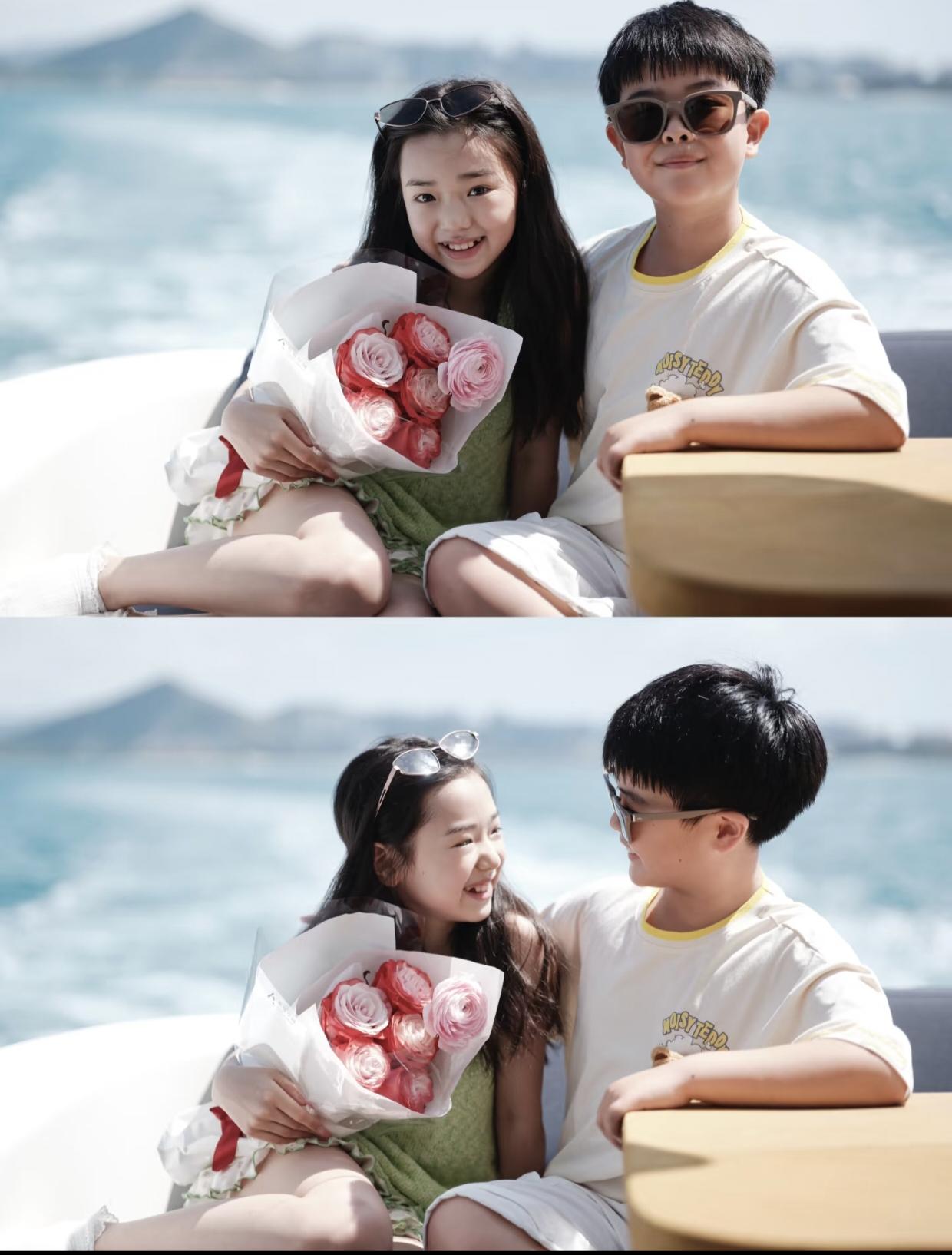 佟丽娅儿子和董璇闺女这组合照,是不是过于亲密无间了? 小酒窝这个依偎的姿势,加上抱着的💐,感觉太像小情侣了。 但是两个孩子其实都还可小,远达不到恋爱的年龄。 看得出来,丫丫是很钟意酒窝这个未来儿媳妇的。 不仅在朵朵生日会上公开调侃他俩,跟小酒窝也是亲如母女。 佟大为的儿子该有压力了吖。[呲牙]