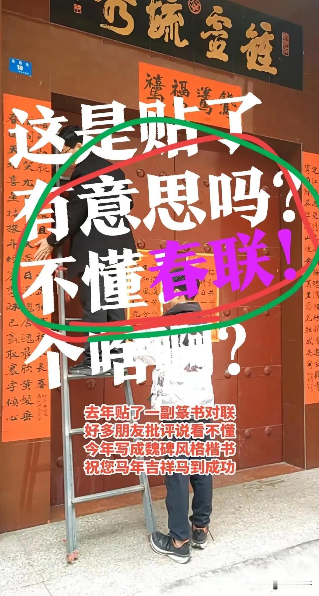 【贴对联,犯愁啊!】这可咋办?每年贴对联,都犯愁!跟农村的大门都不一样!你看看,邻居家的大门上的对联!这是贴了个啥意思? 好看吗?邻居家估计也实属无奈,门框两边窄,每年贴个春联都挤得不行,一整年开门关门,得掉个二三十次,反反复复贴反反复复掉,今年一不做二不修,直接不走寻常路,还完美避开猫眼和把手! 邻居还挺有理!还解释上了!为什么会这样贴,往年对联都贴在大门两侧,但由于门框凸起再加上两侧实体墙面积太窄,所以老是掉,今年我不想再反复折腾了,所以才突发奇想,为了避开大门上所有凸起的位置(白色画圈的位置),脑子排版眼睛为尺,一次成功! 以后卖门的,能不能考虑一下这个贴春联的要求!卖门的都得看一下,为客户想下贴春联的问题,我家也这样,今年往里缩,还好些! 天南地北大拜年 带着春联来拜年 信息图片来源网络侵权联删