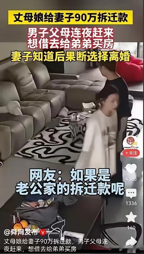 人间清醒!女子娘家拆迁,娘家父母给女子分了90万拆迁款,谁知道钱还没捂热,公婆知道了,老两口连夜赶过来,想找女子借钱给他们的小儿子买房。女子不可置信,当即决定离婚走人! 那天晚上,女子刚把银行卡收好,老公电话就来了,说公婆在小区门口,让她赶紧下去。她下楼时,公婆在寒风里搓着手,婆婆拉着她就往楼上走,说有大事商量。 一进门,婆婆连水都顾不上喝,直接就把话挑明了。说小叔子年纪不小了,谈了好几年的女朋友,就差一套婚房,对方才肯结婚。他们老两口一辈子没什么本事,攒不下几个钱,现在唯一的指望,就是她手里这笔拆迁款。 公公坐在旁边,也跟着叹气,说都是一家人,打断骨头连着筋,这笔钱先借他们应急,等以后有钱了一定还。 女子当时就愣住了,半天没说出话来。 这钱是她爸妈心疼女儿,怕她在婆家受委屈,手里有点底气才给她的,是完完全全属于她个人的钱,跟婆家没有半毛钱关系。 结果呢,消息刚传出去,婆家就像闻着味一样赶来了,没有一句关心,没有一句感谢,上来就是要钱,还是给小儿子买房这种天大的数目。 她转头看向自己老公,本想他能说句公道话,没想到老公只是低着头,含糊其辞地劝她:“都是一家人,帮帮弟弟怎么了,不然这婚结不下去,咱们脸上都不好看。” 那一刻,女子心彻底凉透了。 她终于看明白,在这个家里,她从来就不是家人,只是一个自带资源的外人。有用的时候是一家人,需要掏钱的时候,谁都想来分一杯羹。 他们从来没想过,这笔钱是她爸妈的血汗钱,是她往后过日子的安全感,是她万一受委屈时的退路。他们只想着自己小儿子的婚事,只想着怎么把她手里的钱变成自家的资产。 什么借钱,说得好听。真借出去了,就是肉包子打狗,有去无回。不借,就是无情无义、小气抠门,以后在婆家永远抬不起头,还会被老公埋怨一辈子。 女子没有吵,也没有闹,只是平静地说了一句:“这钱我不会借,这日子,我也不想过了,离婚吧。” 公婆当场就炸了,又是骂又是劝,说她狠心、说她不顾亲情。老公也不敢相信,平时温和的妻子,居然会这么坚决。 可女子心意已决。 她很清楚,今天能开口要90万给小叔子买房,明天就能打着各种旗号,把她榨得一干二净。娘家给她的底气,不是让她在婆家忍气吞声的,而是让她在遇到不公时,可以潇洒转身。 真正的亲情,从来不是单方面无底线地付出,更不是盯着别人的口袋算计。婆家这种拎不清、只知道吸血的家庭,越早离开,对自己越好。 女人这辈子,一定要守住属于自己的东西,不管是钱,还是尊严。别因为一句“一家人”,就掏空自己去满足别人的贪心。你越心软,别人越得寸进尺;你越清醒,才越能过得安稳。 各位读者你们怎么看?欢迎在评论区讨论。