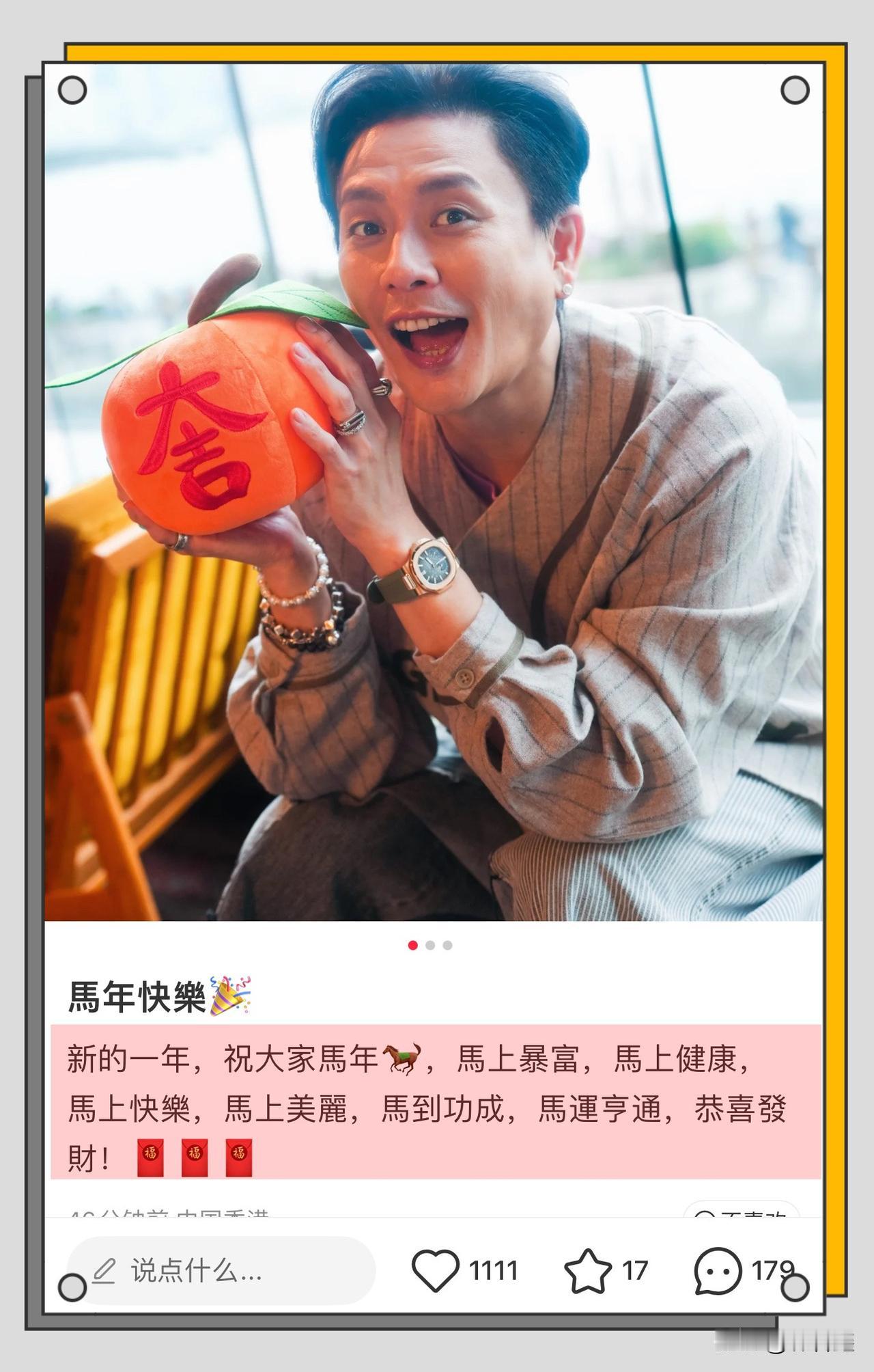黄宗泽晒自拍给大家拜年,一身潮流穿搭,帅气十足,网友:“黄三岁”早点进组 TVB男神黄宗泽刚刚在网上晒出三张照片,给大家拜年! 45岁的黄宗泽穿着阔腿牛仔裤,格子上衣,手上带了很多戒指和手链,戴着一个耳钉,头发乌黑浓密,整个人帅气十足,手里捧着写着“大吉”的玩偶,年轻有活力,不愧是TVB男神,这么多年依旧这么帅气有型! 网友们也纷纷送祝福,还有网友希望他早点进组,多拍戏给大家看! 黄宗泽 黄宗泽情史 黄宗泽跳舞