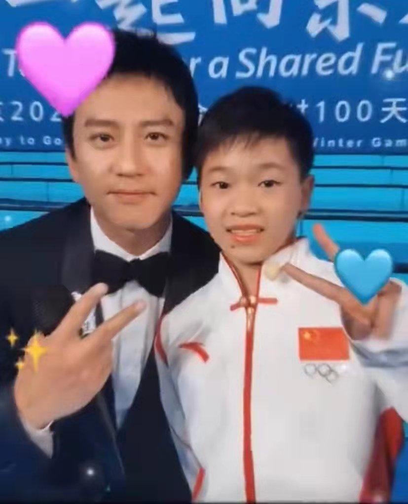 那年全红婵很可爱,邓超一如既往的逗比,他们做着一样的手势动作合影了。