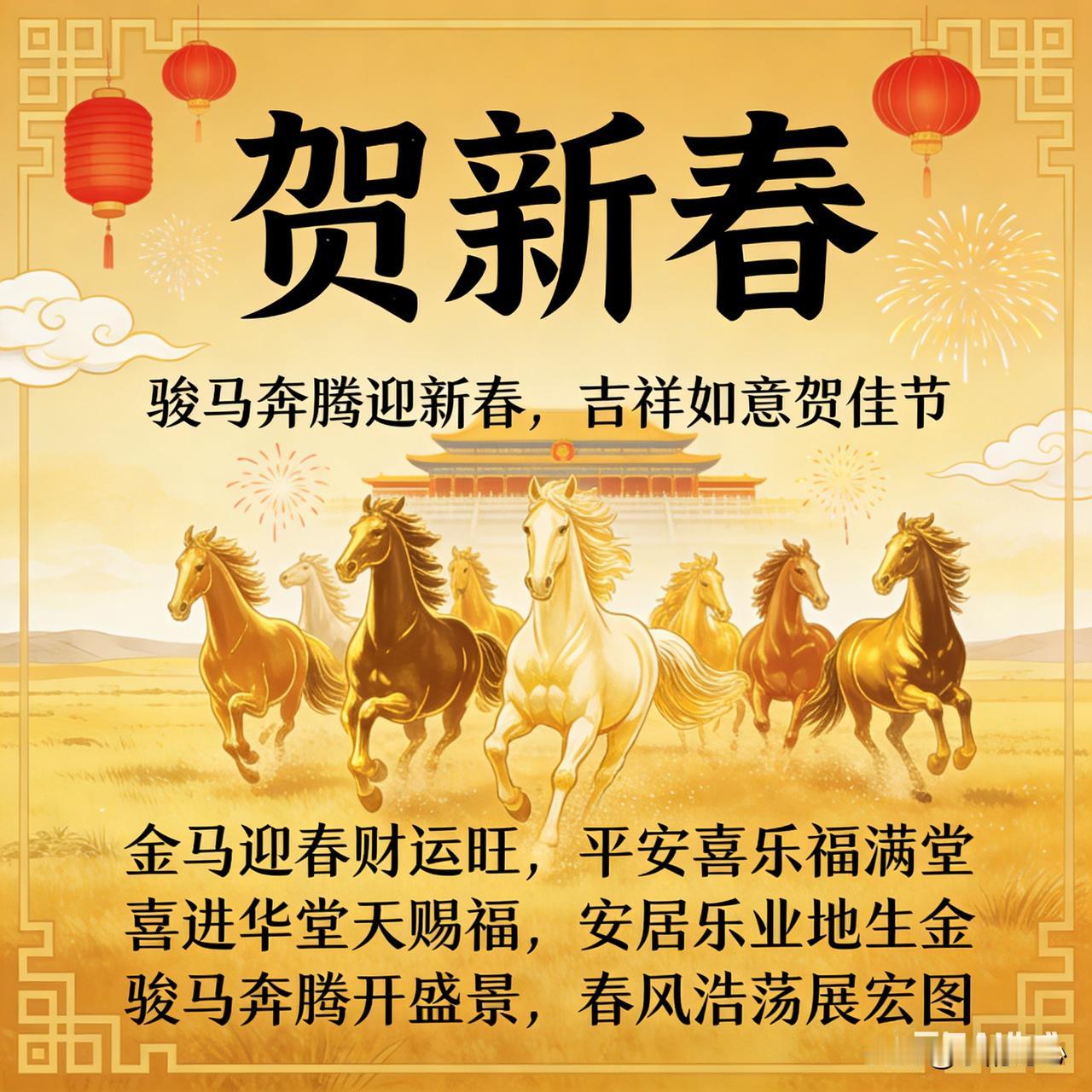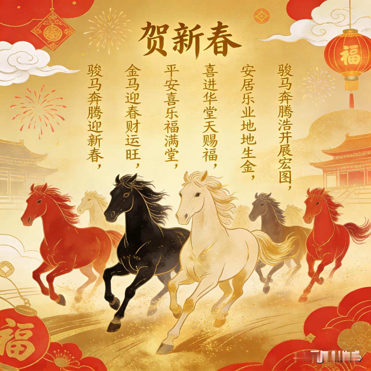 《贺新春》乐韵诗心原创诗词: 骏马奔腾迎新春, 吉祥如意贺佳节。 金马迎春财运旺, 平安喜乐福满堂。 喜进华堂天赐福, 安居乐业地生金。 骏马奔腾开盛景, 春风浩荡展宏图。 这首诗词以新春为背景,通过"骏马奔腾""春风浩荡"等意象,展现辞旧迎新的喜庆氛围与美好愿景:首联以"骏马"喻奋进姿态,"吉祥如竞"凸显节日的热烈;颔联"金马迎春"暗合生肖文化,"财运旺""福满堂"寄寓财富与平安的双重祈愿;颈联"天赐福""地生金"将传统福文化与生活愿景结合,体现天人合一的哲学观;尾联"开盛景""展宏图"以磅礴气势收束,既呼应开篇的奔腾意象,又将个人祝福升华为对家国昌隆的期待。全诗通过"马-春-财-福-风-图"的意象链,构建起多层次的祝福体系,既有民俗元素的生动呈现,又含对未来的积极展望,语言通俗而不失典雅,节奏明快如新春鼓点,尽显盛世佳节的祥和气象。