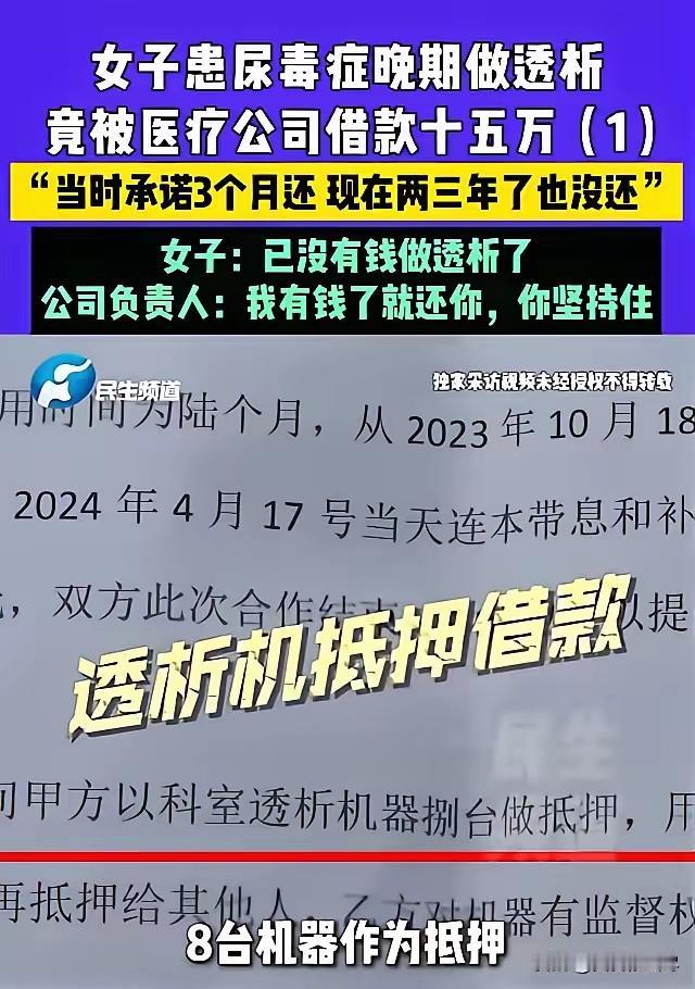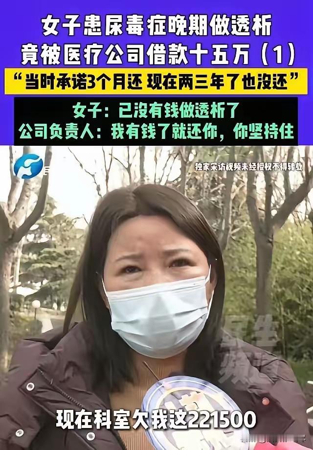 河南许昌,女子得了尿毒症,做透析时认识了科室负责人,对方借走她15万,承诺3个月归还,3年过去了,女子已经到了晚期急需换肾,可对方借她的钱迟迟不还。女子多次找她要钱,对方称:我有钱了就还你,你坚持住! 这笔钱不是普通的积蓄,是女子留着救命的换肾费用。 当初出于信任,才把钱借给医院科室的负责人,谁也没想到会是这个结果。 承诺三个月归还,一拖就是三年,女子的病情也拖到了晚期。 每一次催要,得到的都是轻飘飘的一句话,没有实际行动,也没有还款方案。 一边是等着钱做手术、随时可能危及生命的病人,一边是迟迟不还欠款的熟人。 本该是让人安心的医患关系,此刻却变成了让人绝望的拉扯。 病人在生死边缘挣扎,每一分每一秒都在和时间赛跑。 欠款人一句轻飘飘的坚持住,根本撑不起一个人活下去的希望。 借钱时说得再好,不兑现承诺,所有的保证都成了空话。 用别人的救命钱拖延度日,消耗的是别人的生命,也是自己最基本的良心。 大家愿意相信身边的人,可这份信任不该被这样随意辜负和消耗。