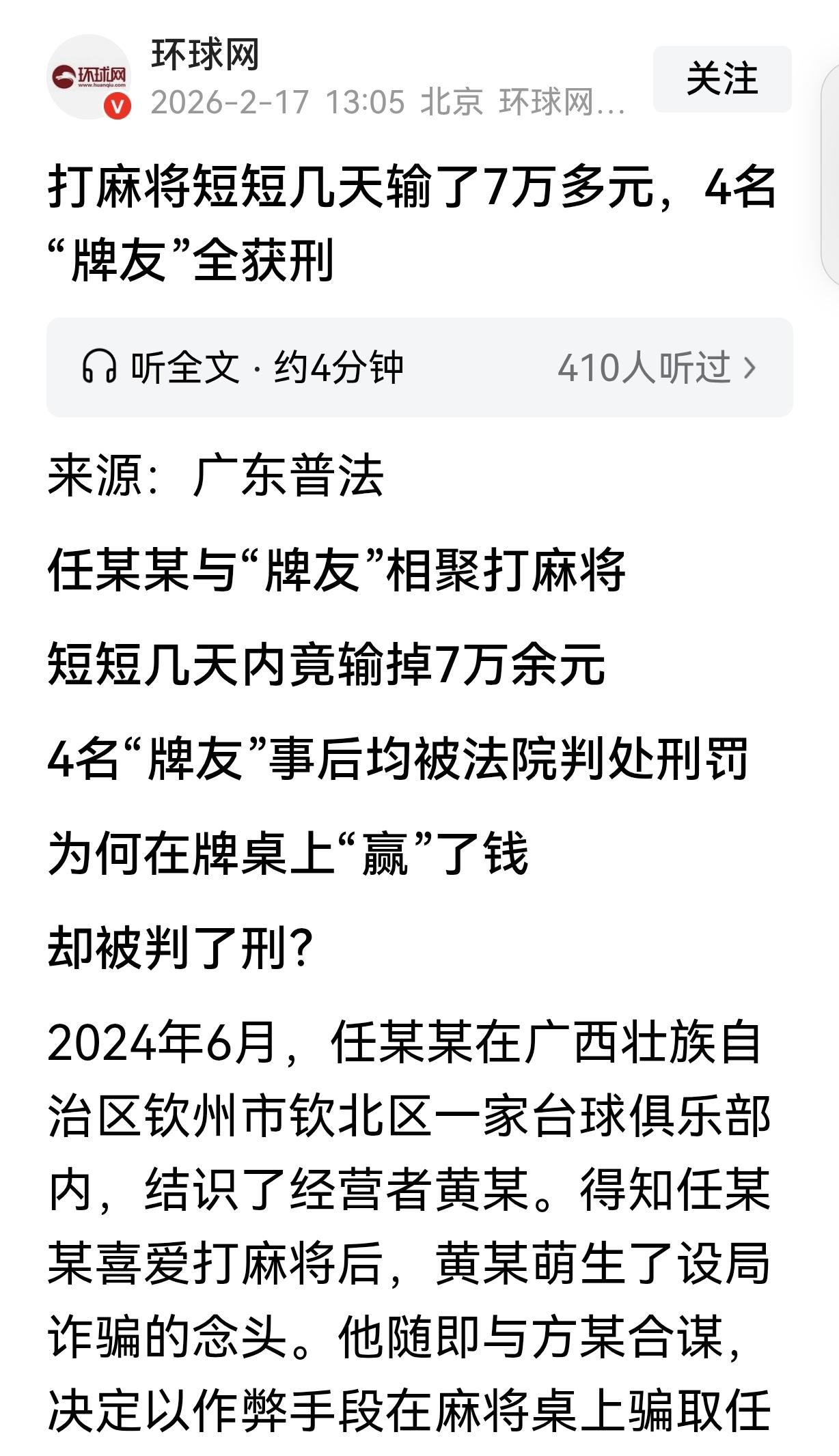 广西钦州,一男子开了家台球俱乐部,他发现男子任某爱打麻将,还有钱,就找了3个人做局,让任某把钱输光,4人用微信小程序计分,每分代表20元,通过特定手势,或牌张摆放方式传递信息,相互喂牌、做大牌型,导致任某一下子输了70000多,任某觉得不对劲,赶紧报了警,结果悲剧了! 2024年6月的一天,任先生去台球俱乐部消遣,一来二去,跟俱乐部老板黄某熟了,没事就在一起闲聊。 黄某跟任先生东拉西扯时,精准找到了他的七寸,这个任先生不但爱打麻将,兜里还有几个钱。 黄某立马计上心来,他随后找到了方某,如此这般一番交代,于是,他们又找来覃某与简某,4个人一拍即合,决定做局把任先生身上的钱赢过来。 4人分工明确,毕竟黄某跟任先生熟悉,由他提供场地,并邀请任先生来打牌。 怎么才能让任先生光输不赢呢?那就得方某,覃某,和简某3个人配合。 怎么配合呢?他们设计了特定手势,还有牌的摆放方式,来传递信息,相互喂牌、做大牌型,让任先生毫无察觉。 那么,赢来的钱怎么分呢?平分的话,有的人吃亏有的人占便宜,这样不公平,这难不住黄某,他决定 用微信小程序计分,每分代表20元,谁功劳大,谁就拿的多。 准备就绪后,7月13日,被蒙在鼓里的任先生,接受了黄某的邀请,兴致勃勃来了,他以为就是普通的牌局,跟以前一样,输赢无常,就是图个乐子。 可他哪里知道,自己一脚踩进坑里,以前玩牌,这局输了,下局就赢回来了,输赢也没多少钱。 可这次,他从坐在牌桌上就没赢过,一输到底,在这个过程中,黄某还装好人,假装和任某某组成“利益同盟”,承诺和他共担输赢。 直到输了70000多,任先生才感觉不对劲。他怀疑自己被几个人做局了,也顾不上其他的了,赶紧报了警。 有人说,麻将遍地都是诈骗,分工合作,麻将机械作弊,色子遥控……等诈骗无处不在,请远离赌博。多数都是有关系背景的开麻将馆,你懂的。 这种做局的很多的,奉劝大家不要跟那种不太熟的人打牌,知根知底的人如果有坏心眼还能防着点,不熟悉的人你都不知道人品怎样的。 还有人说,以前也被人做过一次,打20元一场输一万三千多,叫我那个人叫了两个我唔认识的打,后来才听人说叫我那个人是老千来的,叫他出来都不敢出了,一早报警还好。 这起台球俱乐部老板联合他人做局骗钱的案例,着实让人警醒。 黄某等人为了钱财,精心策划骗局,利用特定手势和牌张摆放方式作弊,让任先生在不知不觉中输掉大量钱财,这种行为不仅违背道德,更是触犯了法律。 这种娱乐本身就存在诸多风险,像这种被人做局的情况更是防不胜防。 它不仅会让参与者遭受经济损失,还可能引发一系列社 会问题,比如家庭破裂、债务纠纷等。 这也提醒我们,在日常生活中一定要远离赌博,不要抱有侥幸心理,以为能靠打牌发家致富。 同时,对于那些不太熟悉的人邀请参与牌局等类似活动,更要提高警惕,谨慎对待,避免陷入他人设下的陷阱。 《刑法》第266条规定,诈骗公私财物,数额较大的,处三年以下有期徒刑、拘役或者管制,并处或者单处罚金;数额巨大或者有其他严重情节的,处三年以上十年以下有期徒刑,并处罚金。 在此案例中,黄某等人通过做局骗取任先生7万余元,属于诈骗公私财物且数额较大,符合该法条的处罚情形。 最终,黄某被判有期徒刑3年4个月,并处罚金5000元。 简某、覃某被有期徒刑3年,缓刑4年,各并处罚金4000元。 方某被判处有期徒刑11个月,缓刑1年2个月,并处罚金4000元。 法院责令黄某退赔被害人经济损失1.36万元。 对此,你怎么看?