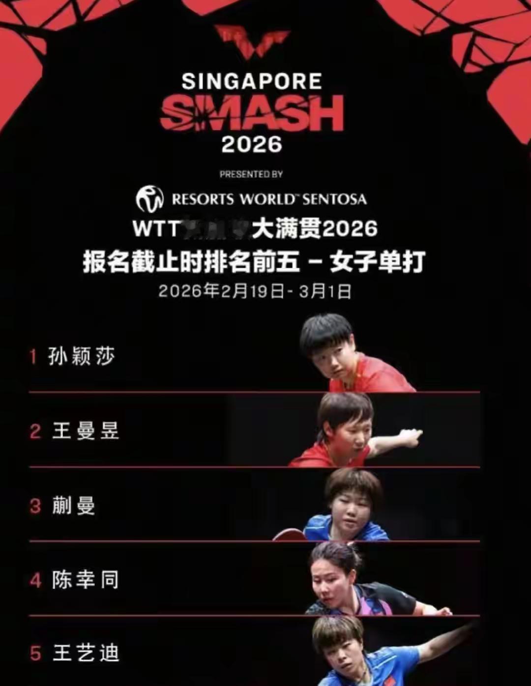 祝愿国乒马年大吉! 2026-02-19至03-01WTT新加坡大满贯赛,2000个积分。 设有男单、女单、男双、女双和混双五项。 国乒17人参赛。 男单:王楚钦,林诗栋,向鹏,陈垣宇,周启豪,陈俊菘,黄友政,温瑞博共八人。 女单:孙颖莎,王曼昱,陈幸同,蒯曼,王艺迪,陈熠,石洵瑶,何卓佳,覃予萱共九人。 混双:黄友政/陈熠 男双:林诗栋/黄友政 女双:蒯曼/陈熠 2025新加坡大满贯赛国乒包揽全部五项冠军! 女单冠军孙颖莎 男单冠军林诗栋 混双冠军林诗栋/蒯曼 男双冠军林诗栋/王楚钦 女双冠军王曼昱/蒯曼 2026-03-10至03-15,WTT重庆冠军赛,1000个积分。 设有男女单打两项。 国乒11人参赛 男单:王楚钦,林诗栋,梁靖崑,向鹏,周启豪。 女单:孙颖莎,王曼昱, 陈幸同,蒯曼,王艺迪,陈熠。 2025重庆冠军赛冠军赛 女单孙颖莎 男单王楚钦 祝福大胖梁靖崑新年首战WTT重庆冠军赛! 祝愿国乒马年大吉!