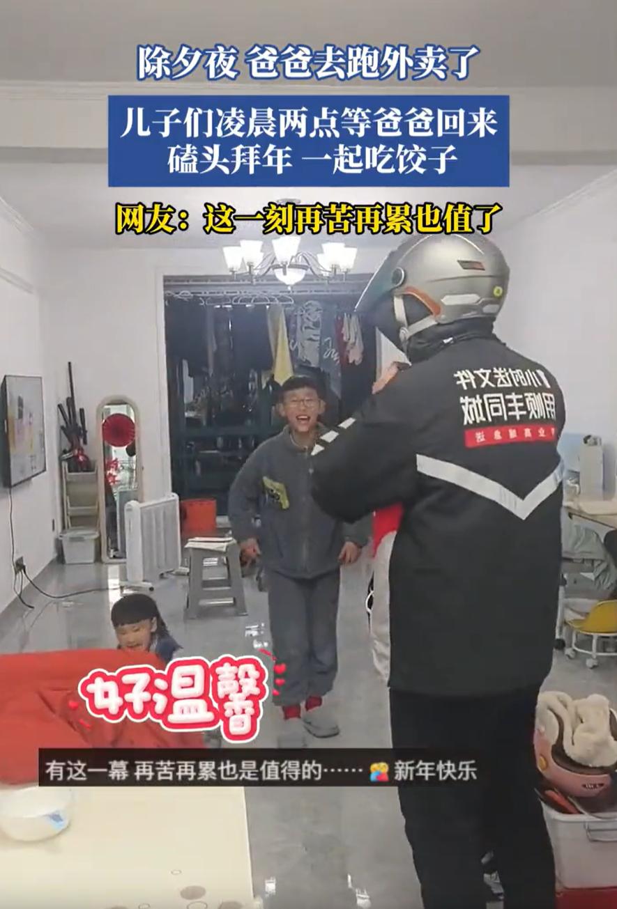 看哭了!安徽,一男子除夕夜并没有在家过年,而是为了多赚点钱出去跑外卖,凌晨2点回家时,本以为老婆和孩子都已经睡了,结果一开门,两个儿子突然跑过来磕头拜年。那一瞬间,一切辛苦都值得了 男子是两个孩子的父亲,因为过年当天单价比较高,所以在家里吃完年夜饭,就换上衣服出去跑单子了,而这一跑就到了凌晨2点 开门回到家,头盔还没来得及摘,就听到儿子喊“爸爸回来喽”,然后两个孩子直接滑跪到爸爸面前,一边磕头一边说新年好,而妻子也是赶紧到厨房煮饺子 妻子把这个视频发到网上后,表示对现在的生活很知足,孩子懂事,丈夫一直为家里努力,只要一家四口在一起,生活就是美好的 网友看哭了。有人说这是今年看到最暖心的视频,有人说这才是真正的年味,有人想起了自己在外打工的父亲 确实,对这位父亲来说,可能最珍贵的不是赚到的钱,而是回到家时,看到孩子们那种毫无保留的热情和真诚,那一刻让他所有的疲惫都瞬间变得有意义 两个孩子那一跪,跪出来的是懂事。他们知道爸爸在外面跑了一天,知道要等爸爸回来拜年。这种懂事不是天生的,是看在眼里的