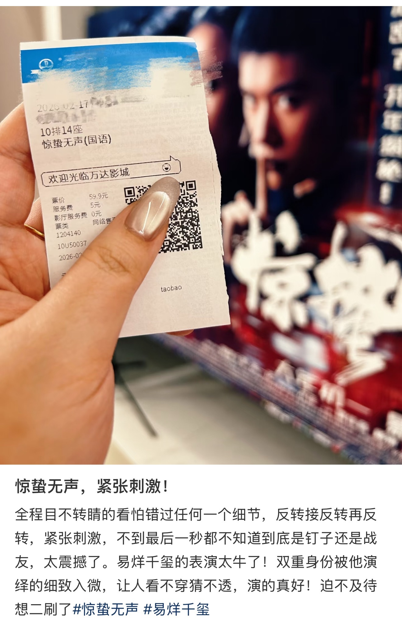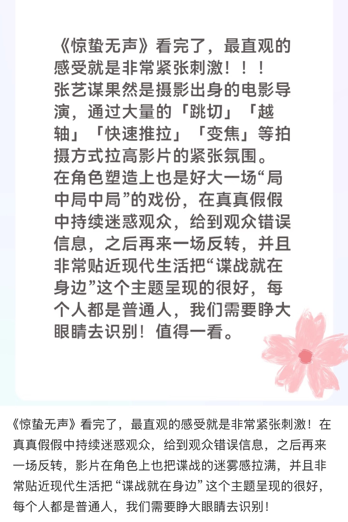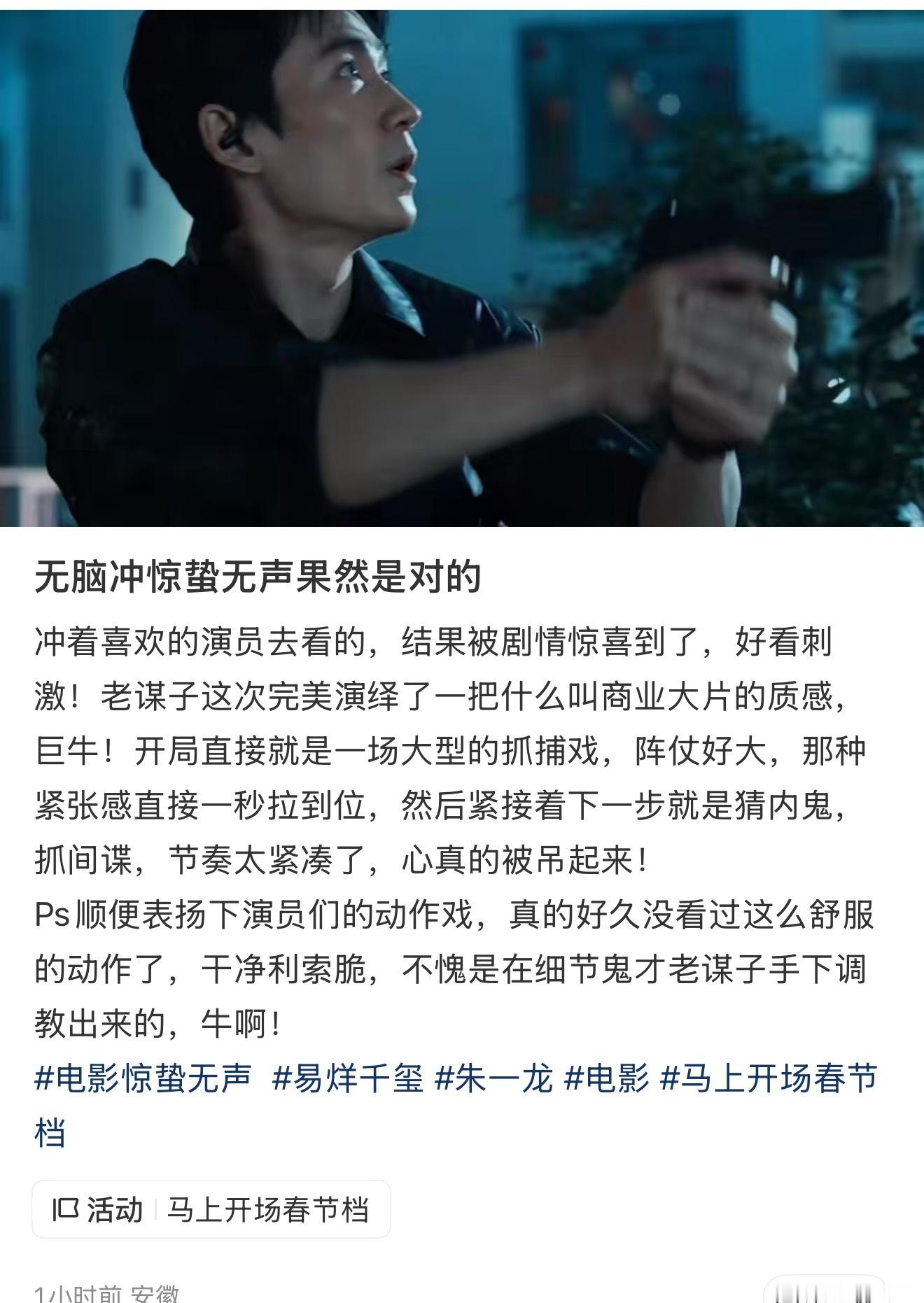 惊蛰无声 紧张刺激《惊蛰无声》好看!!!全程节奏紧凑、步步惊心,从开头就代入感拉满,看得人全程屏息,心一直悬着。没有多余煽情,不搞空洞说教,全是实打实的高能博弈与暗战张力,张艺谋的镜头美学和叙事细节依旧到位,隐喻精巧又不抢戏。春节档看得最过瘾、最沉浸的一部,值得二刷三刷!👍
