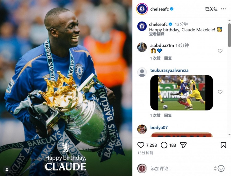 直播吧2月18日讯今天是法国足坛名宿马克莱莱的53岁生日,老东家切尔西为他庆生。