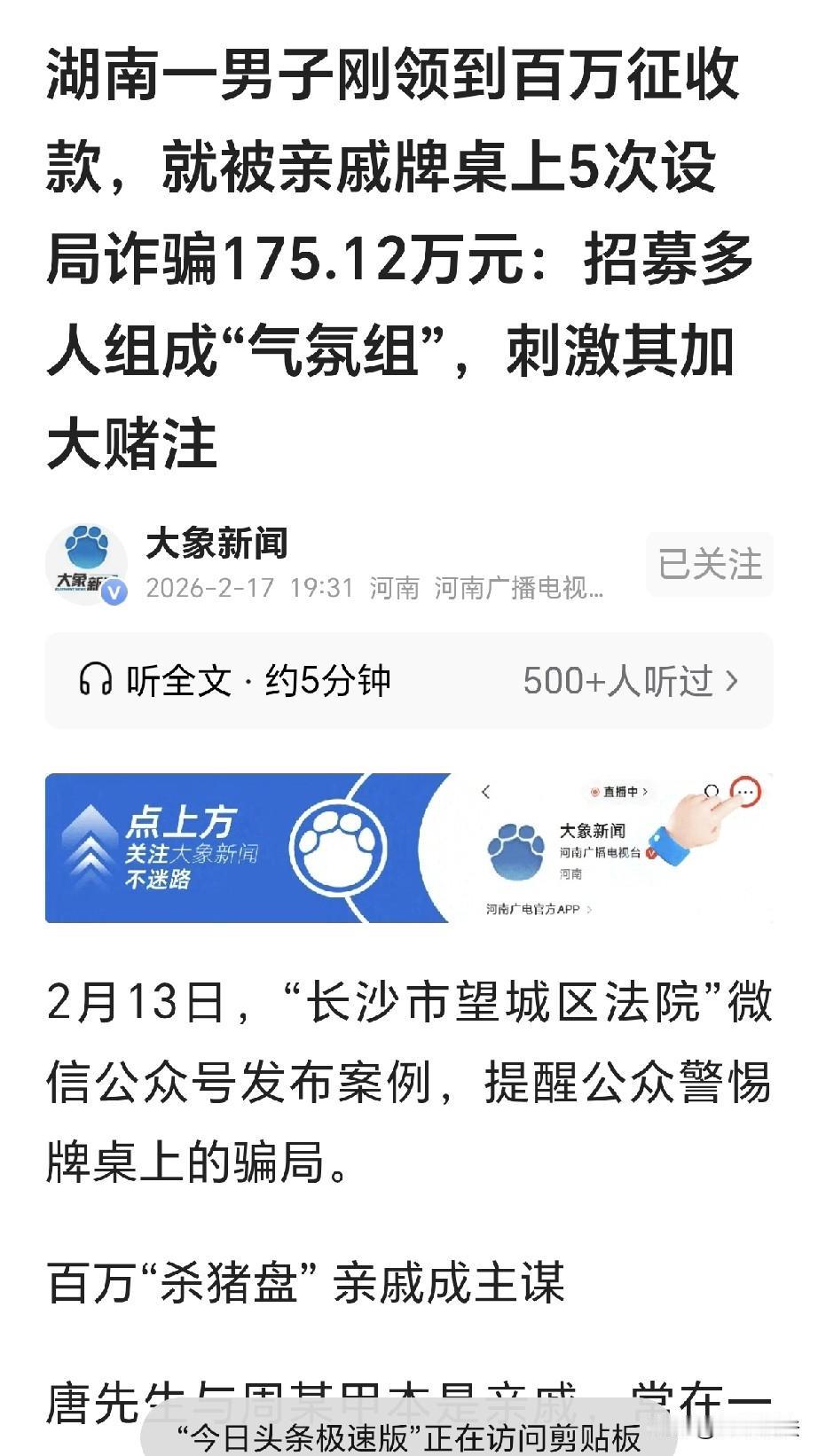 “千万留个心眼,对亲戚也一样!”湖南长沙,一男子老屋拆迁,给他赔了几百万元拆迁款,谁知亲戚眼红了,联合外人给他设下“杀猪局”,为了让男子相信,亲戚请人烘托气氛,男子不知是计,5场赌局输了175.12万,资金流进了亲戚女友账户,然后他们一分,烘托气氛的人员按次数领取报酬,男子这才发现,自己被亲戚算计了,多亏他留了个心眼,其中有60万元始终没给对方,男子立刻报警,网友: 这年头还有人信亲戚? 唐某喜笑颜开,他发了大财,他家房子拆迁,几百万拆迁款刚刚打到账上。 唐某立刻就想躺平,这笔钱足够他过完下半辈子。 谁知这事传遍了亲戚,亲戚们知道他发财了,有人眼红,有人恭喜。 唐某从此以后,走路带风,腰杆挺直,很快就被亲戚周某甲盯上了。 周某甲心生嫉妒,凭啥要他小子发财,而我还要过穷日子? 周某甲暗自观察,发现唐某爱打麻将,他喜欢打牌,水平还不咋地,一旦打牌输了,他就会十分冲动。 他只要上头,啥都不顾,只想着再加大筹码,以为这样就能稳赢不输。 周某甲有了主意,他立刻行动,找到了朋友周某乙,两人一拍即合,决定以“斗牛”的方式给唐某设个“杀猪盘”。 2023年9月,周某甲把茶社当成了据点,他编造各种理由,不停的在唐某耳朵边呱噪。 他今天说有个特别的牌局,明天说有几个高手要切磋武艺。 他软磨硬泡,用了各种的手段,只想哄着唐某参赌。 唐某开始还有点犹豫,可架不住周某甲的花言巧语,再加上他本身也爱打牌,稀里糊涂就走进了牌局。 周某乙暗自得意,码牌的时候他早就做了标记,他抓耳挠腮,用小动作来操控输赢。 每次轮到唐某揭牌,他总是一把天崩开局。 他不服气,不相信手气就这么的臭,他一把连着一把,即便输了也不服气! 周某甲等人屡战屡胜,几圈下来,打的唐某节节败退。 他们伙同一气,要求唐某用现金结算,而周某甲几人却无需兑现。 周某甲还不满足,又拉拢严某加入了团伙,严某心狠手辣,最擅长偷看和换牌。 有了他的加入,“杀猪盘”变得更加的疯狂严密。 唐某像一只待宰的羔羊,完全被他们耍来耍去。 为了让骗局更加逼 真,周某乙招募了一群人组成“气氛组”。 这些人大呼小叫,气氛被烘托的那叫一个热闹。 他们一会儿配合切牌,一会儿抬高押注。 他们故意的喊着:“这把肯定赢,加大注!” 唐某顿时热血沸腾,他越输越急,他不断的加赌,总以为自己能大赢一场。 谁知他越玩越大,越输越狠,钱像过手的流水一样,呼呼的流到了周某甲女友账户。 钱一到账,他们几人就会私下瓜分,气氛组的成员会按照出场的次数,领取他们表演的报酬。 从2023年9月到2024年1月之间,周某甲周某乙一共组织了5次赌局。 他们就像贪婪的饿 狼,从唐某的兜里,硬是骗走了175.12万元。 但是因为一些原因,其中有60万元没有诈骗成功。 唐某开始怀疑,他就不信,为何自己把把都输,他暗自观察,终于发现其中的猫腻。 他突然明白了,自己是被周某甲周某乙等人联手骗了,他回想了过程,处处都透着诡异。 他平静下来一想,这才感觉他们是在表演假剧,唐某急了,立刻拨打了报警电话。 警方展开调查,很快就将周某甲周某乙等人抓获归案。 经过调查,确认无疑,周某甲周某乙美梦一场,不义之财,终将他们送上了法庭。 《刑法》第266条规定:诈骗公私财物,数额较大的,处三年以下有期徒刑、拘役或者管制,并处或者单处罚金;数额巨大或者有其他严重情节的,处三年以上十年以下有期徒刑,并处罚金;数额特别巨大或者有其他特别严重情节的,处十年以上有期徒刑或者无期徒刑,并处罚金或者没收财产。 周某甲等人合谋设局,从策划牌局到分工作弊,均是为了骗取唐某的钱财,符合诈骗罪的核心要求。 团伙成员周某乙利用码牌做标记,严某通过偷看换牌等手段隐瞒作弊事实。 他们同时安排了气氛组烘托氛围,从而误使唐先生认为,输钱是他自身运气不佳所致。 这种“虚构事实+隐瞒真相”的欺诈行为,导致唐某产生了错误认识,不断投入了更多的资金。 诈骗五十万元以上即属数额特别巨大。 周某甲等人通过诈骗设杀猪局获得既遂金额达115.12万元,属于数额特别巨大。 因此法院判觉,周某甲等人的行为构成诈骗罪,分别判处几人有期徒刑12年到3年不等。 有人认为,这年头还有人信亲戚?杀的就是熟人! 也有人说,唐某就是无脑之人,就是发了财,也是守不住财的,人傻钱多而已! 更有人说,有钱以后一定要脱离原来的圈子,保护好自己,给谁都不要多说,只要自己过好日子。 对此,你有什么观点,如果是你,你又会咋办?