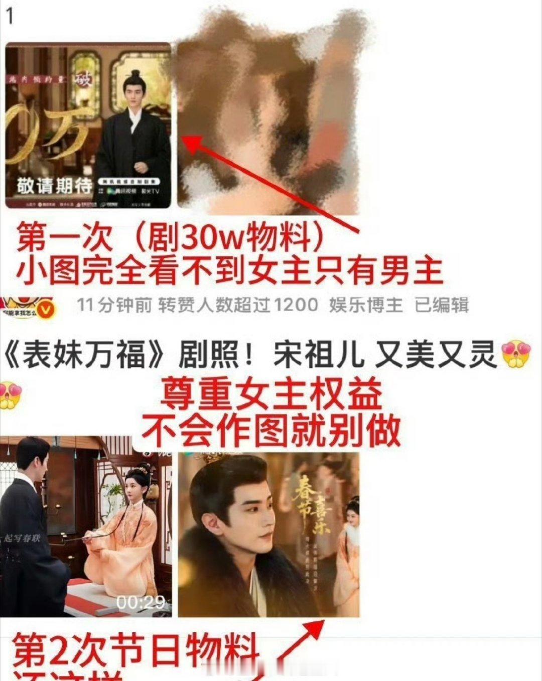 宋祖儿粉丝在找表妹万福维权,说是剧物料小图只能看到男主看不到女主