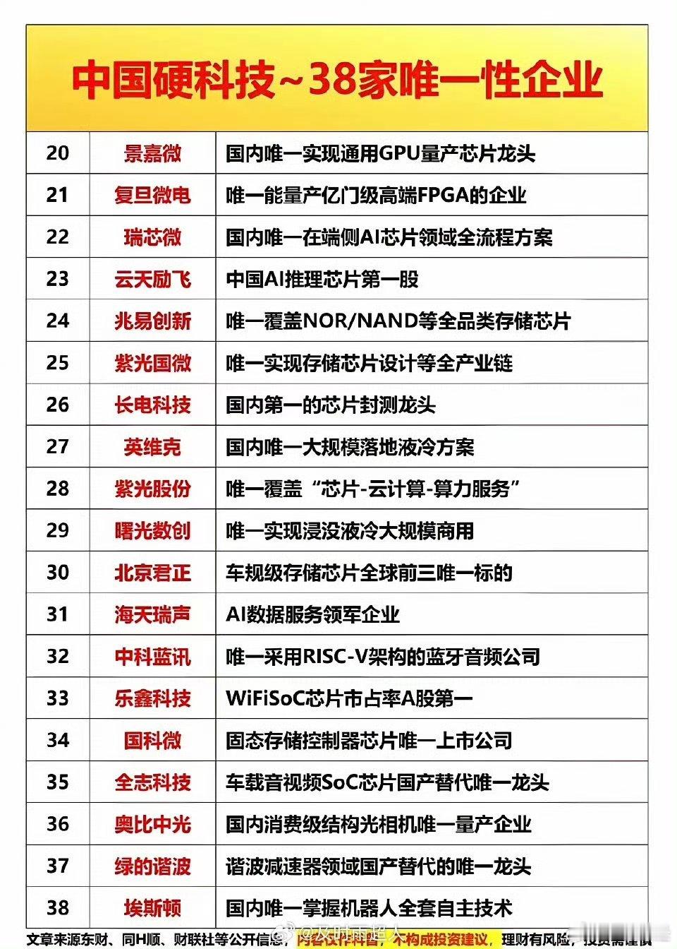 中国硬科技“唯一”力量:38家企业撑起国产自主底气!这些公司每一家都是细分赛道的国产标杆,代表着中国科技自主的底气。这些“唯一”不仅是技术壁垒,更是中国硬科技崛起的缩影。2026依旧是科技主线,这些具备唯一性的硬核科技公司值得关注!奥比中光是国内消费级结构光相机唯一量产企业;龙芯中科是国内唯一拥有完全自主指令集的CPU厂商;中大力德国内RV减速器市占率全球第四;科大讯飞中国智能语音与AI龙头……⚠️内容仅作科普,不构成投资建议,理财有风险,投资需谨慎。