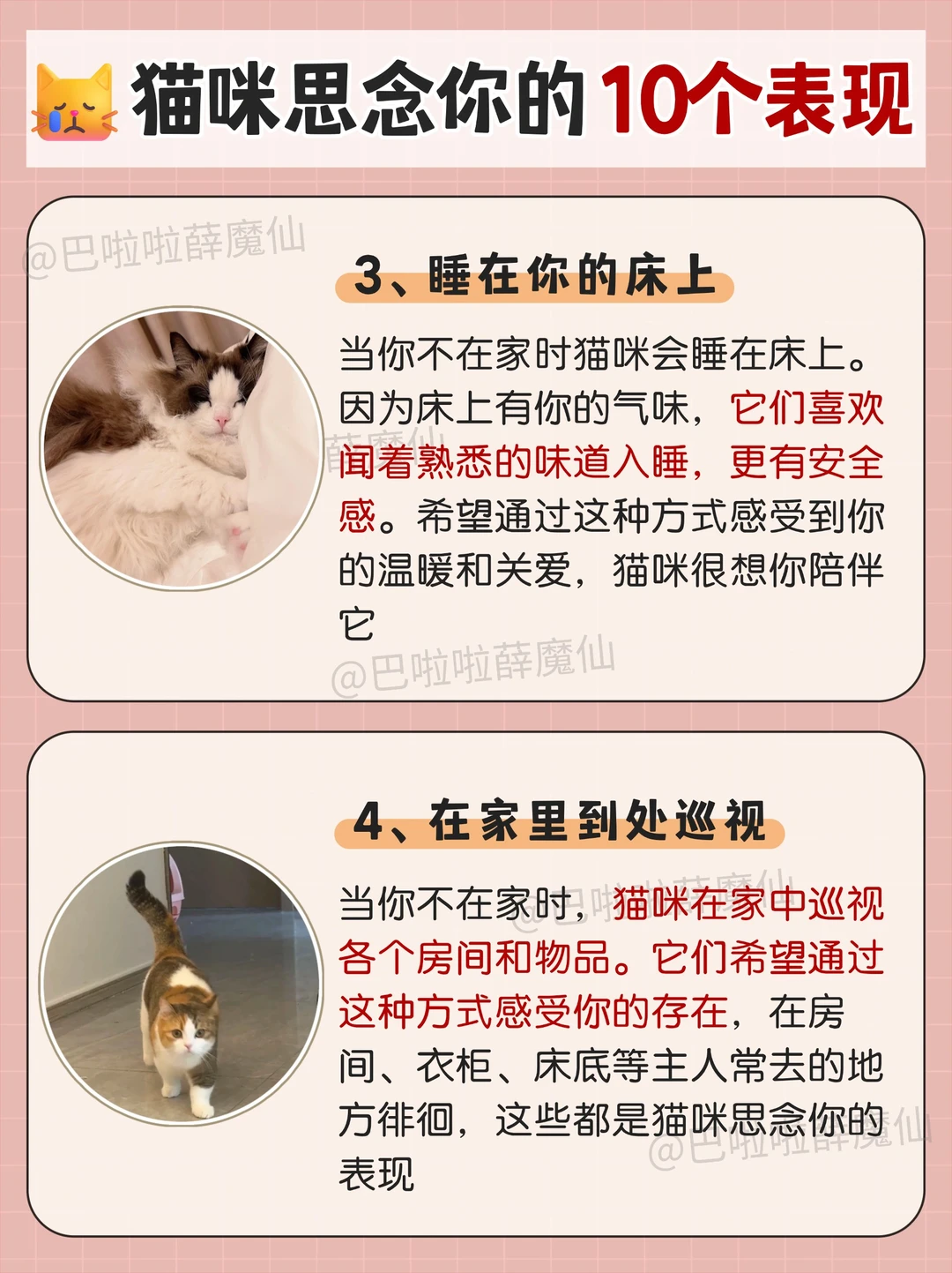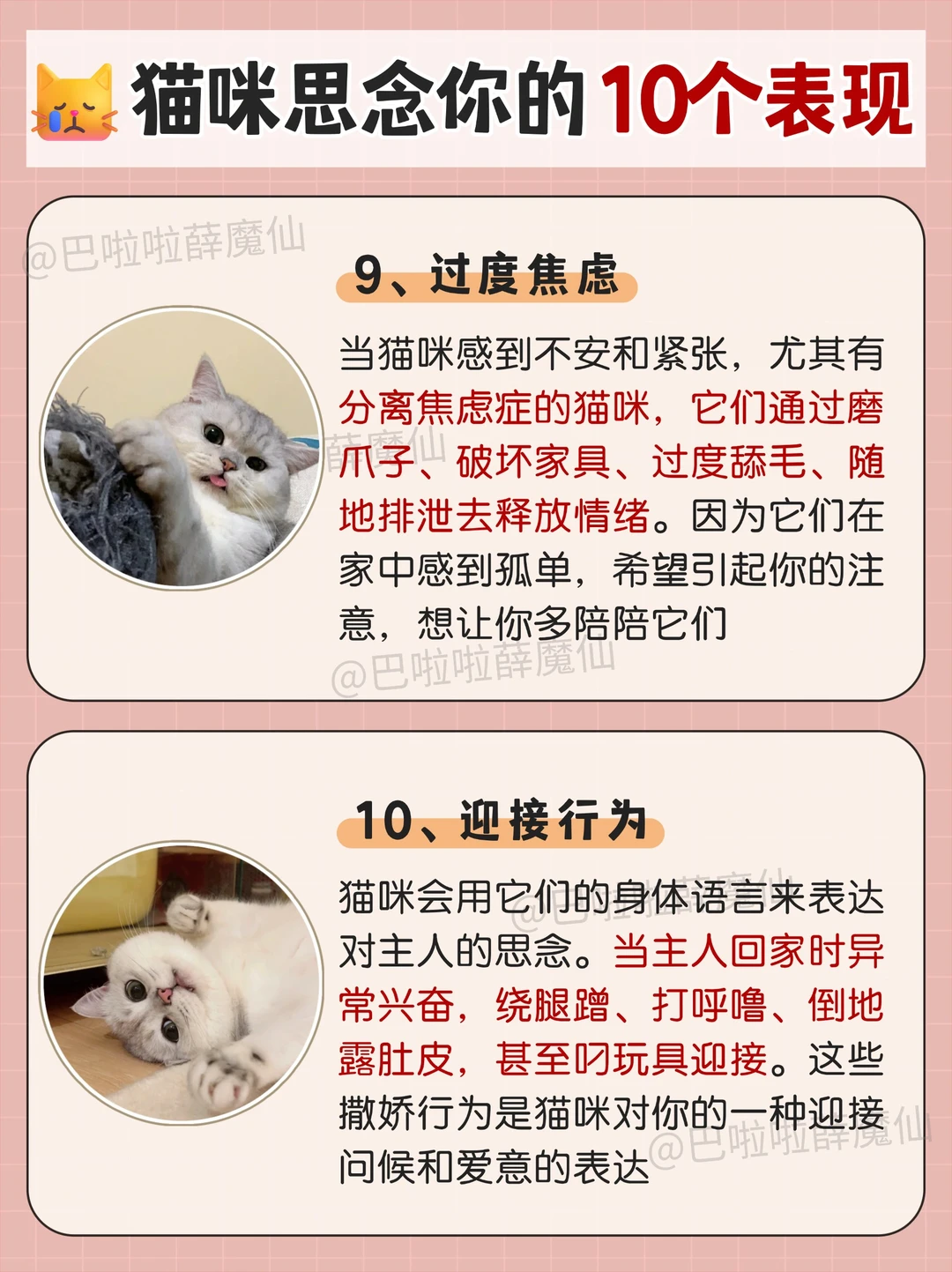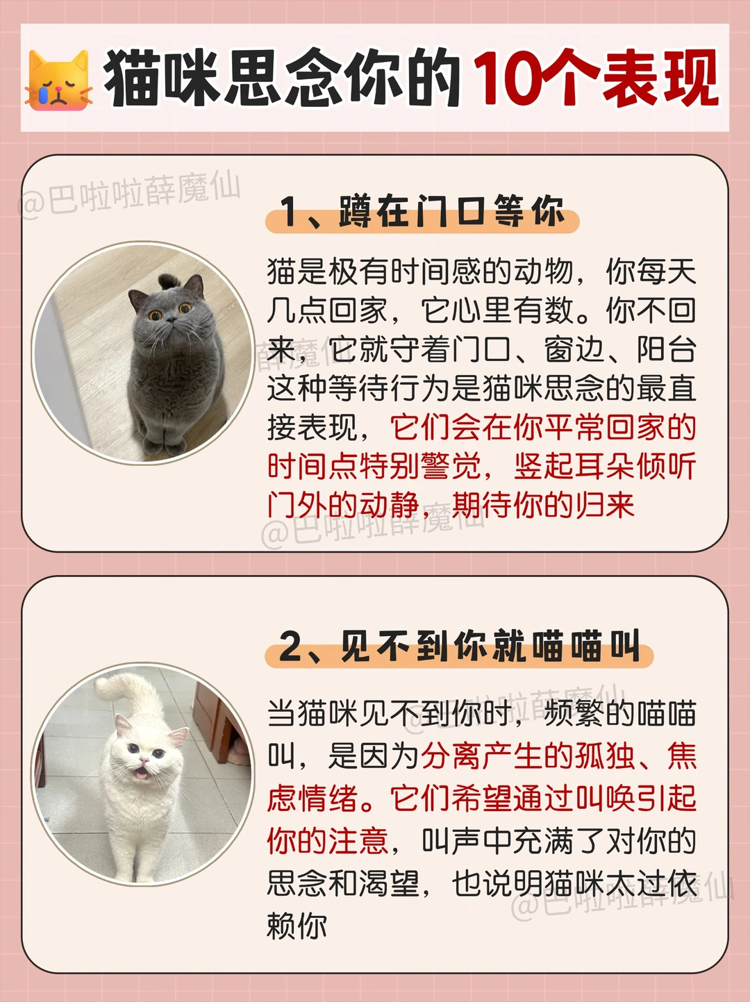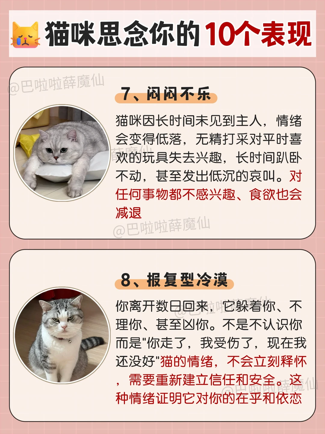 每逢过年就有一批留守小猫独自在家,当主人长时间不在家时,猫咪也会感到孤独和思念。😿猫咪会用一些特殊的方式来表达它们的情感,你一定要知道它真的很想你呀 [一R]蹲在门口等你 [二R]见不到你就喵喵叫 [三R]睡在你的床上 [四R]在家里到处巡视 [五R]啃咬你的衣物 [六R]长时间盯着窗外 [七R]闷闷不乐 [八R]报复型冷漠 [九R]过度焦虑 [一R][零R]迎接行为 🐈猫咪的思念,不张扬,却执着。它没有表情包,没有语言,也不会哭泣,但它用自己的方式,在你不在时,默默维系着对你的联系 😿你以为它很酷,其实它怕你离开后不回来;你以为它不黏人,其实你是它唯一想靠近的人 ❤️猫咪有思念能力,而且,它的思念,是沉默而坚定的陪伴