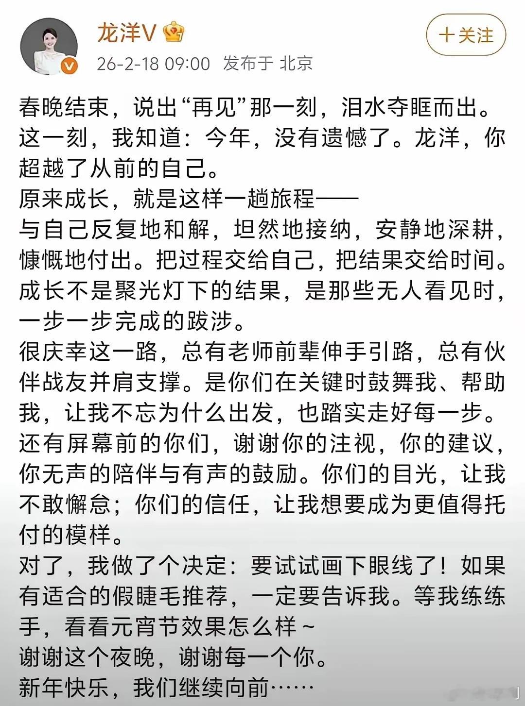 龙洋主持完春晚哭了从《中国诗词大会》到各种综艺类节目,再到央视春晚,龙洋的主持风格越来越沉稳老练,她确实超越了从前的自己。这眼泪从不是脆弱,而是拼尽全力后的释放,更是对职业的敬畏。辛苦了,龙洋!热点观点