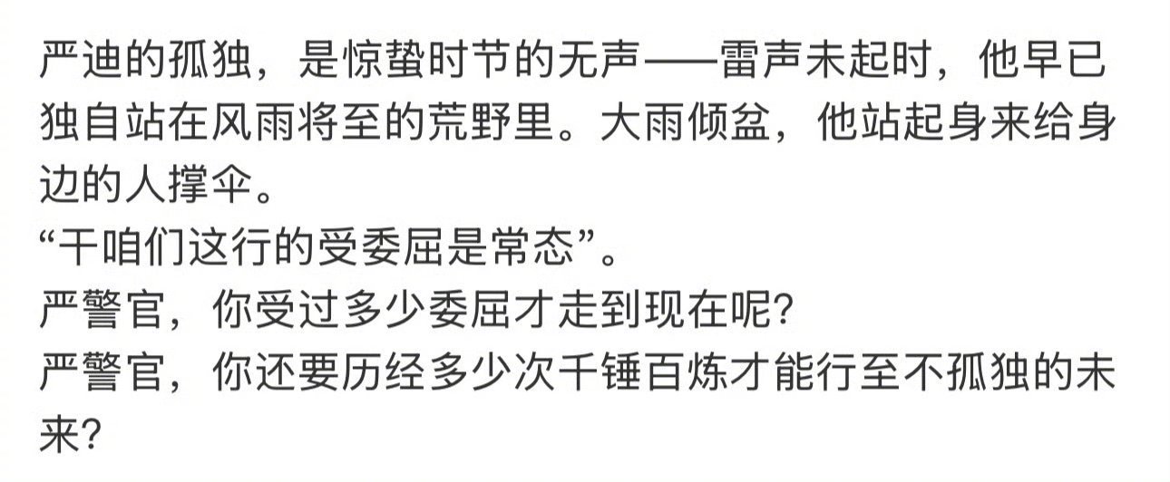 易烊千玺严迪有自己的30秒文学 易烊千玺演的严迪那河边30秒沉默,藏着五年无人懂的隐忍与孤勇。不是没有退路,是他从一开始就选了最难的那条路,信仰刻进骨里,永远心向光明。