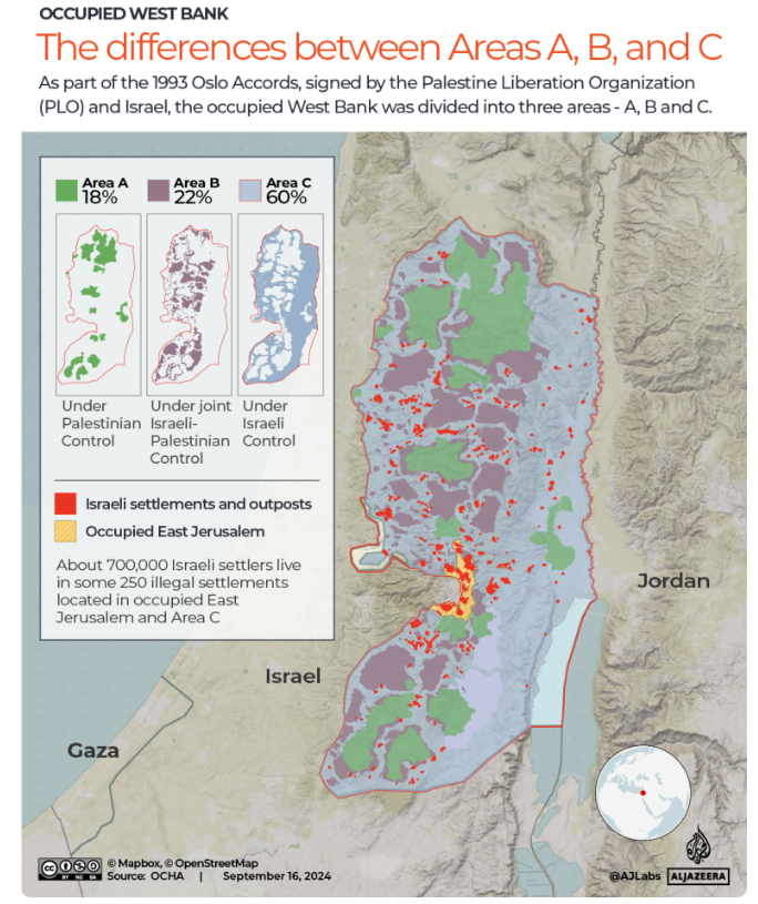 根据巴以1993年签署的《奥斯陆协议》,约旦河西岸地区划分为A、B、C三个区,其中A区由巴方控制,B区由双方共管,C区由以方控制。