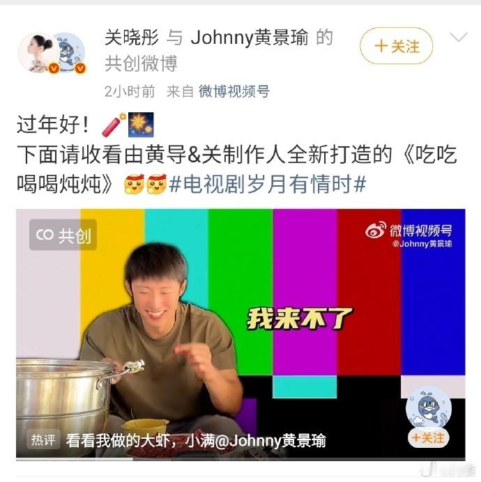 大年初二黄景瑜喊关晓彤吃饭了 春节档快乐源泉锁定他俩✨!黄景瑜关晓彤的《吃吃喝喝炖炖》续集太下饭,围炉火锅局笑料百出。看完更盼《岁月有情时》,张小满和严晓丹的日常必是欢乐加倍,大年初四准时追!