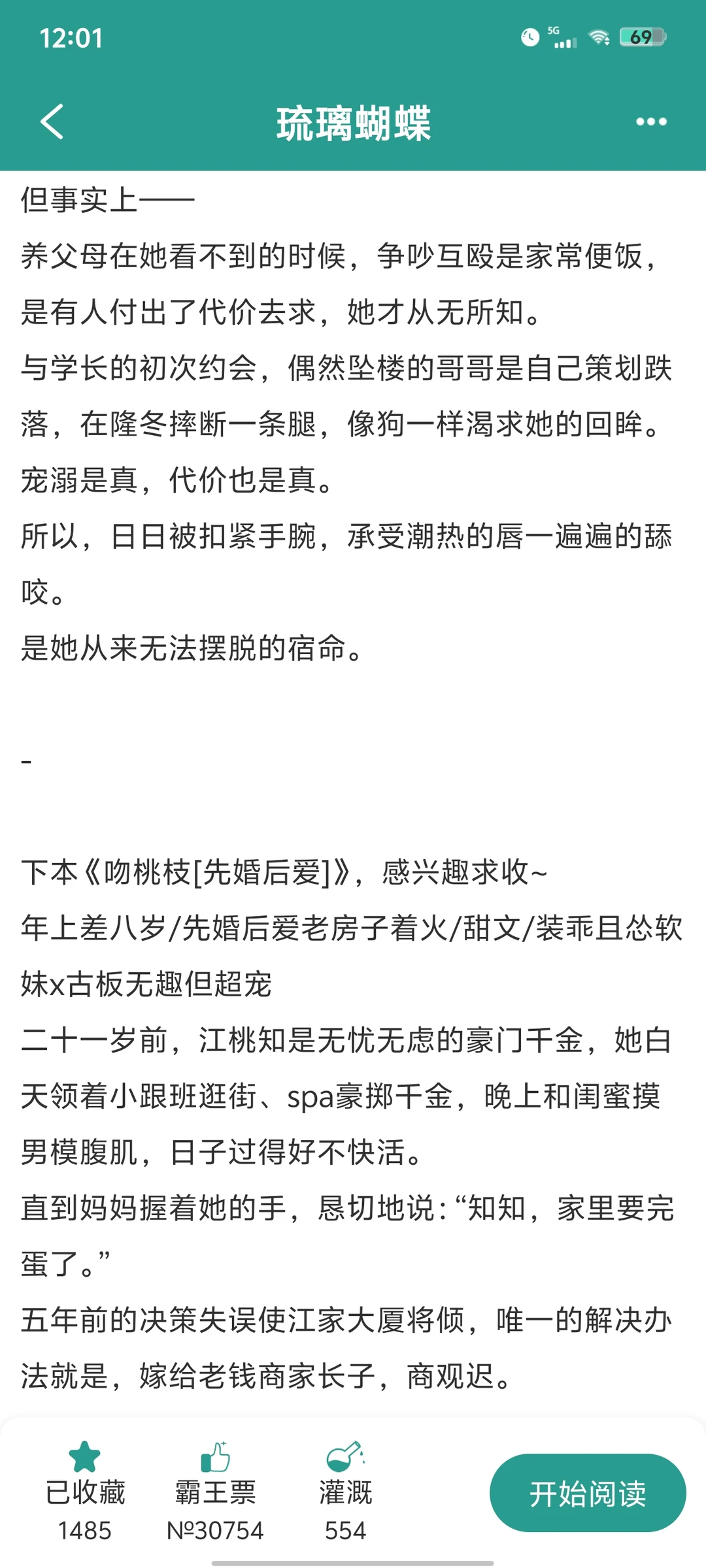 《琉璃蝴蝶》by楚酌月 刚完结的小说,一共119章 青梅竹马,细水长流,年龄差4岁! 全文都很甜很可爱,是双向奔赴的甜美爱情啊!男主超会,撒娇求抱抱一心要女主爱他! [种草R]女主小时候住在男主家,俩人一起长大,叫他哥哥。男主很护着女主,经常照顾她。在这个过程中,男主隐隐察觉到自己对女主心思的转变,不仅是妹妹,还有呵护、爱意,暗搓搓套路。 [郁金香R]女主成年了出国,男主经常给她的社交账号评论,关注她的动态。女主一回国,男主立马来找她,互相试探,暧昧期太好磕了!坦诚心意后就在一起了,两家父母也都乐见其成,甜滋滋。