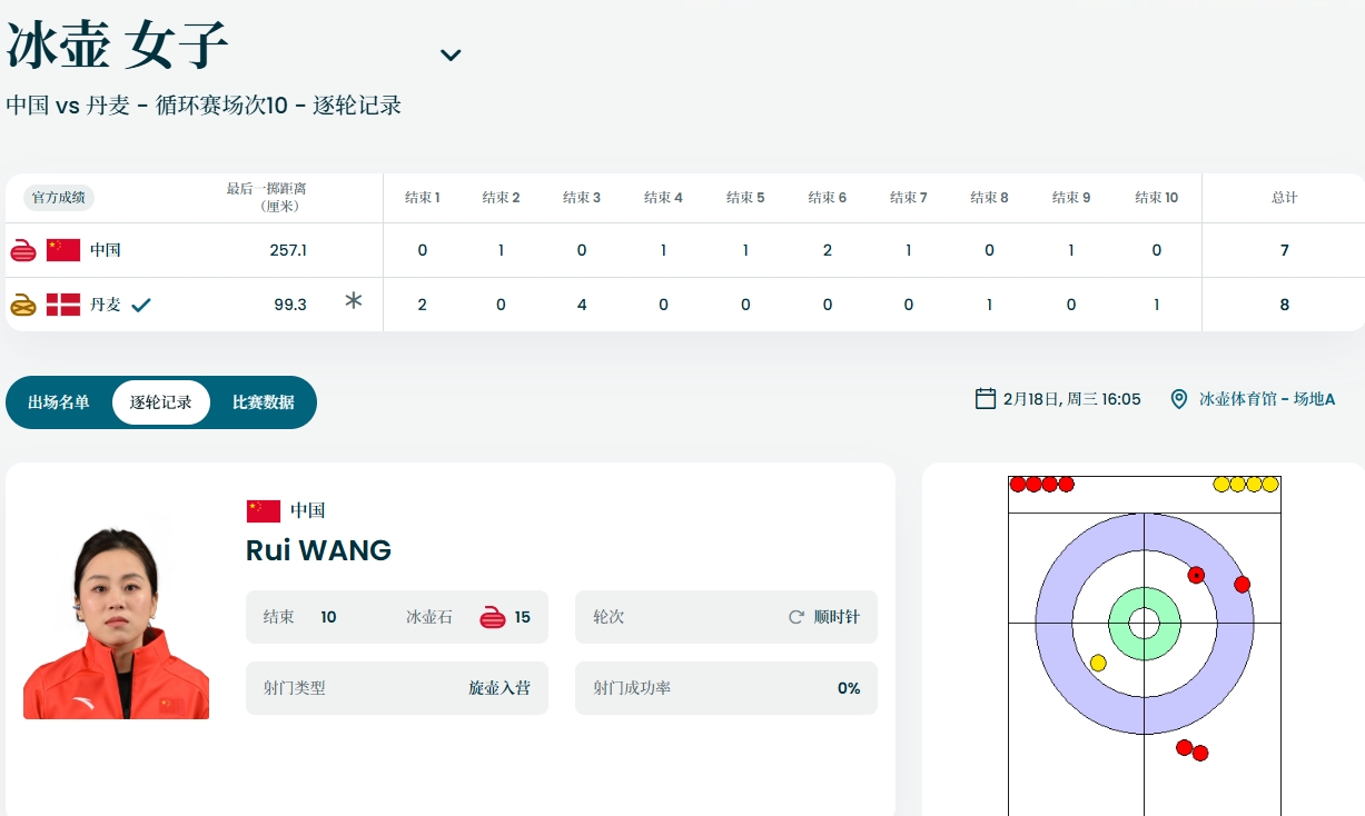 直播吧02月18日讯米兰冬奥会女子冰壶小组循环赛,中国队一度1-6落后追成6-6,但还是7-8惜败丹麦队,遭遇四连败,目前循环赛2胜5负。