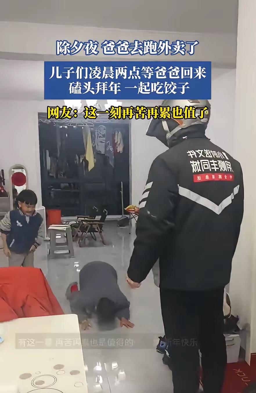 看哭了!安徽,一男子除夕夜并没有在家过年,而是为了多赚点钱出去跑外卖,凌晨2点回家时,本以为老婆和孩子都已经睡了,结果一开门,两个儿子突然跑过来磕头拜年。那一瞬间,一切辛苦都值得了 这段视频我翻来覆去看了好几遍,每次都忍不住红眼眶。镜头里的外卖小哥裹着厚外套,头盔上还沾着点雪粒子,手冻得蜷着,估计刚把车停稳就往家冲。门一开,两道小身影“嗖”地窜出来,“咚”一声跪在地上,脆生生喊“爸爸过年好”,他那瞬间僵住的背影,肩膀微微抖着,伸手想扶又好像不敢碰,最后把俩娃搂进怀里,头埋在孩子颈窝里半天没抬起来。 评论区早就炸开了锅。有个网友说:“我老公也是外卖员,去年除夕他说跑通宵能多拿三倍补贴,我和娃守着饺子等到一点,他进门时睫毛上都是冰碴子,现在看这视频,眼泪根本止不住。”还有人感慨:“小时候总觉得爸爸除夕不回家是不爱我们,长大才懂,他是把所有的爱都换成了柴米油盐。”更有人扎心留言:“谁不想除夕夜窝在被窝里看春晚?可生活哪有那么多选择,肩上扛着家,就得往前冲。” 说实话,这画面里的每一个细节,都像在演我们身边的故事。我见过大年初一凌晨的菜市场,菜贩跺着脚哈着白气卸货;也遇过暴雨天的出租车司机,说多跑一单就能给女儿多报个兴趣班。这些人不是天生愿意辛苦,只是他们把“家”这个字看得比什么都重。就像这位安徽小哥,他或许算不清除夕夜跑的每一单能赚多少,但一定知道,多跑一单,孩子的新书包就能买好点的,老婆的羽绒服就能再厚点。 可看着看着,心里也有点堵得慌。我们总说“为了家人值得”,但值得的背后,是不是也藏着太多无奈?如果节假日的保障能再实在点,如果辛苦付出能被更多人看见和尊重,是不是就少一些这样“不得不”的分离? 不过转头想想,正是这些藏在烟火里的温暖,撑着我们走过难捱的日子。孩子磕的头,是最纯粹的心疼;爸爸搂紧的臂弯,是最踏实的承诺。这大概就是普通人的生活吧,一边被生活推着往前跑,一边被家人的爱拽着不跑偏。它不宏大,却比任何豪言壮语都有力量——因为我们知道,自己的每一步奔波,都在为家人铺一条更稳的路。 各位读者你们怎么看?欢迎在评论区讨论。