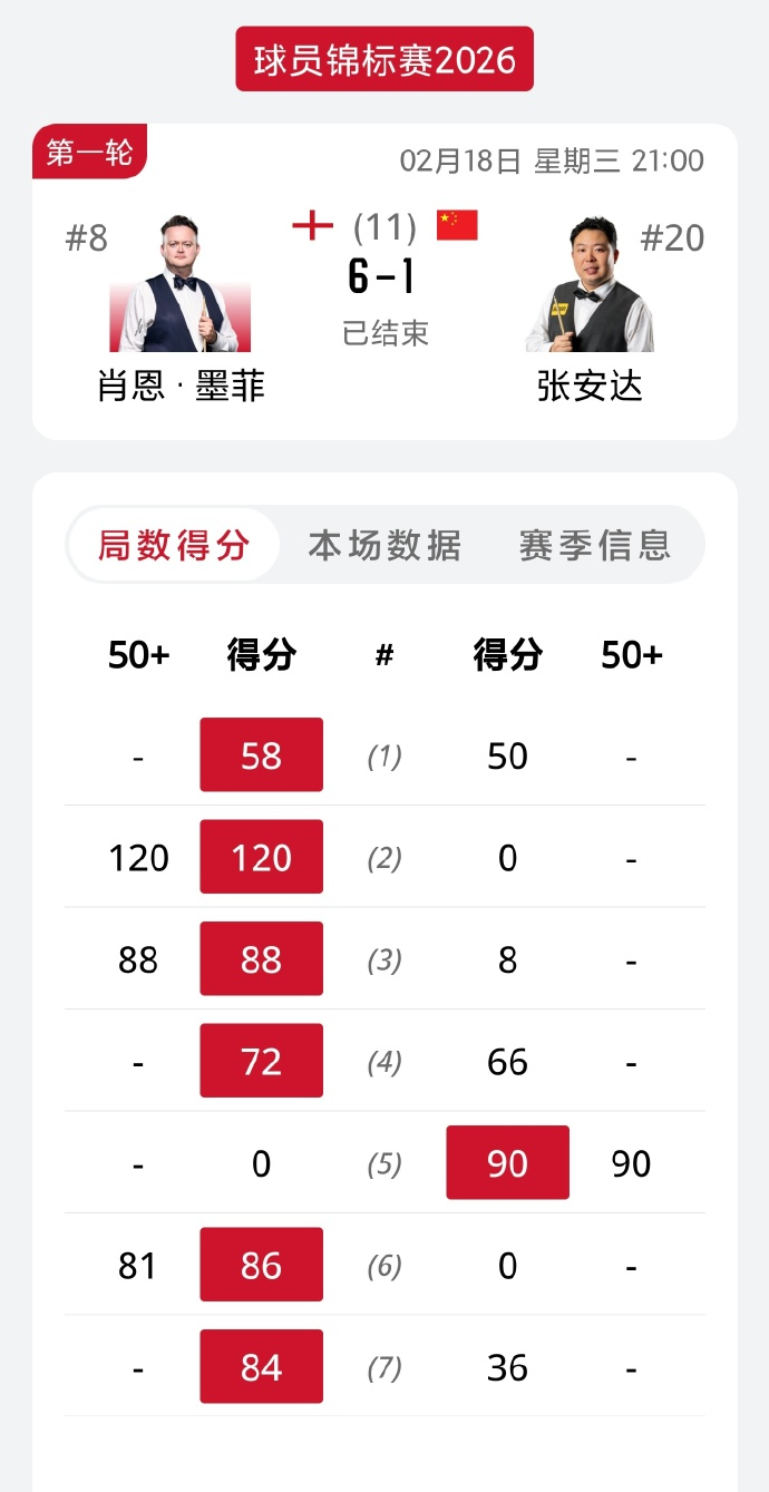 墨菲全场打出一杆破百(120)和两杆50+(88、81),张安达在第五局打出一杆90分。