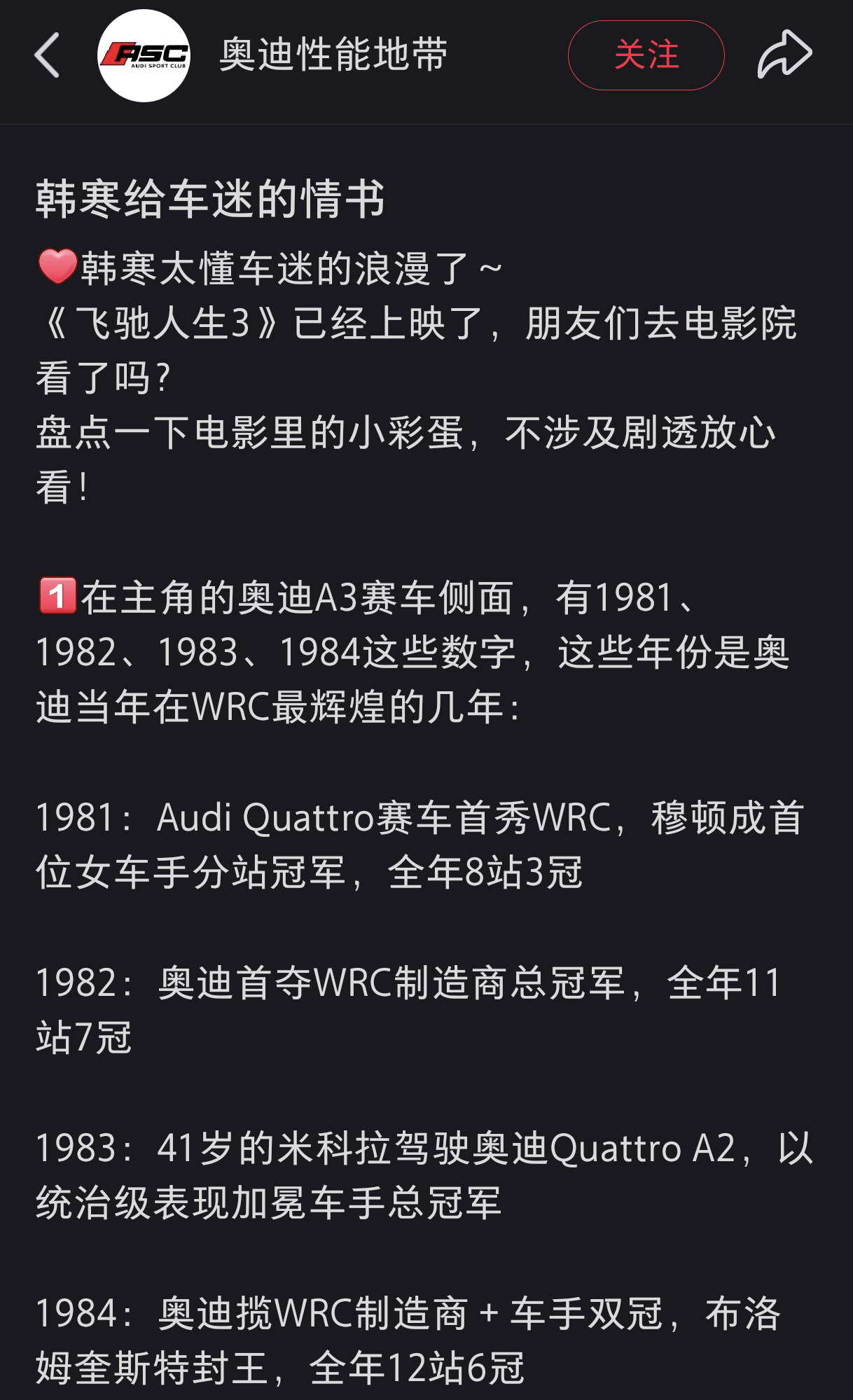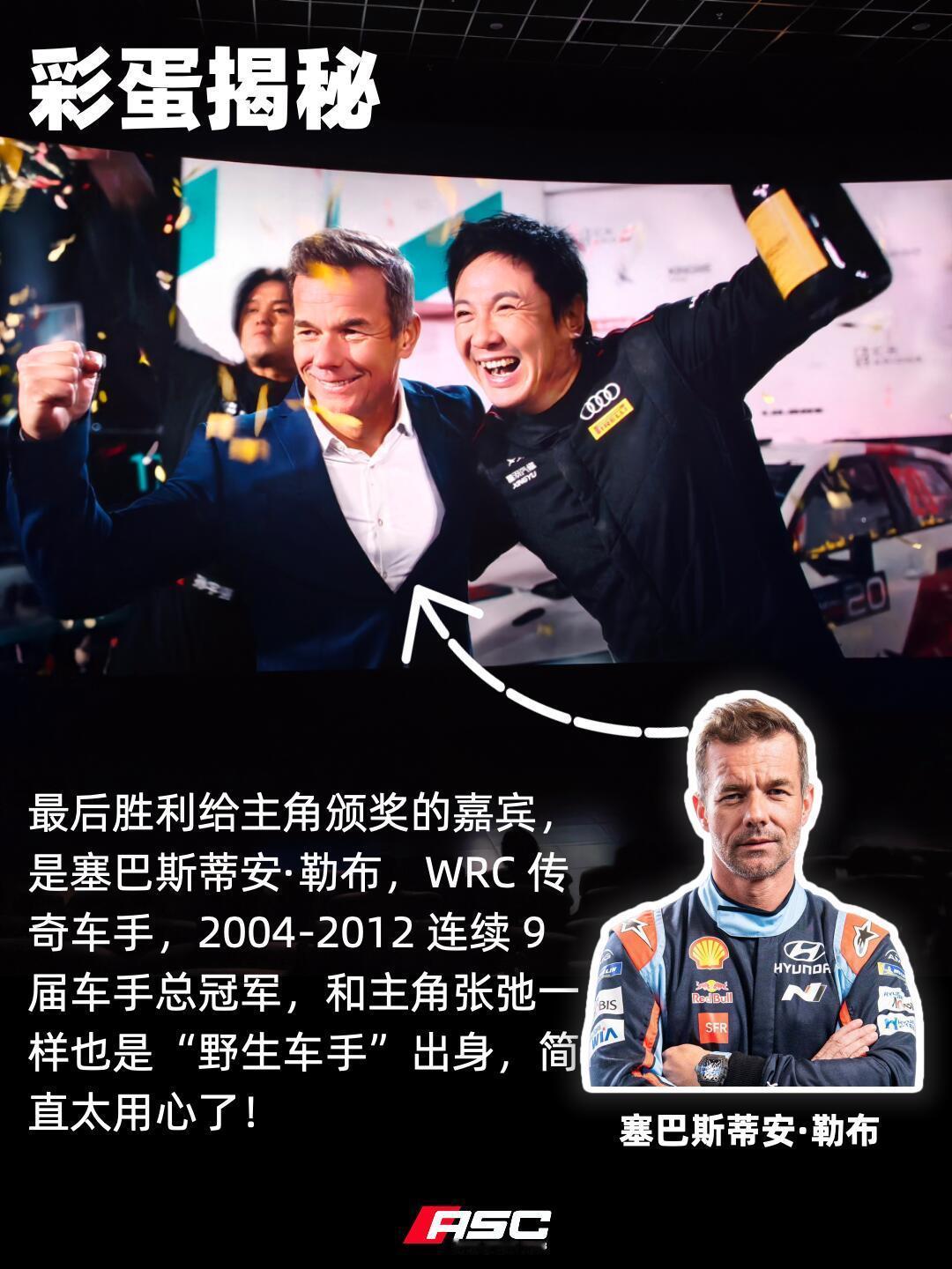 《飞驰人生3》中给赛车迷的彩蛋①黄景瑜饰演的林臻东,驾驶了一台RSQ8去修车厂找张弛,这台是导演自己的车!②决赛颁奖嘉宾,是塞巴斯蒂安・勒布,WRC 传奇车手,2004-2012 连续 9 届车手总冠军,跟主角张弛一样也是“野生车手”出身!