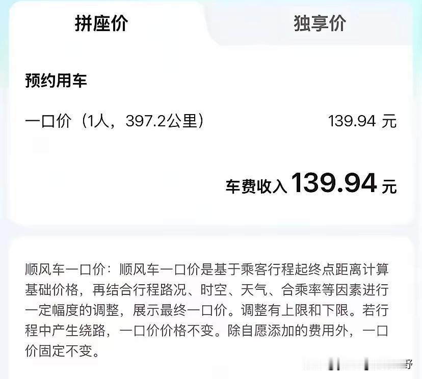 现在顺风车的价格已经那么便宜了吗?有顺风车司机晒出来乘客的订单,差不多400km的里程,拼车的价格还不到140元,即使是独享的价格也才220元。虽说是顺风车,真正的司机不以赚钱为目的,但这种价格对司机来说也没有太大的接单兴趣。毕竟大部分司机也不想白做些无用功。即使自己没有赚油费,但还是付出了时间和劳动力。