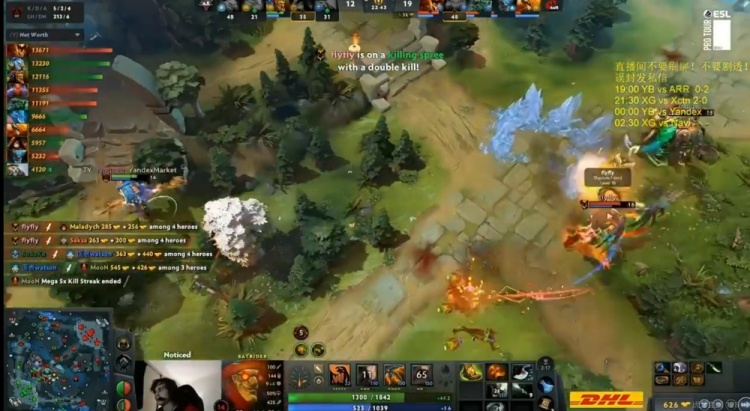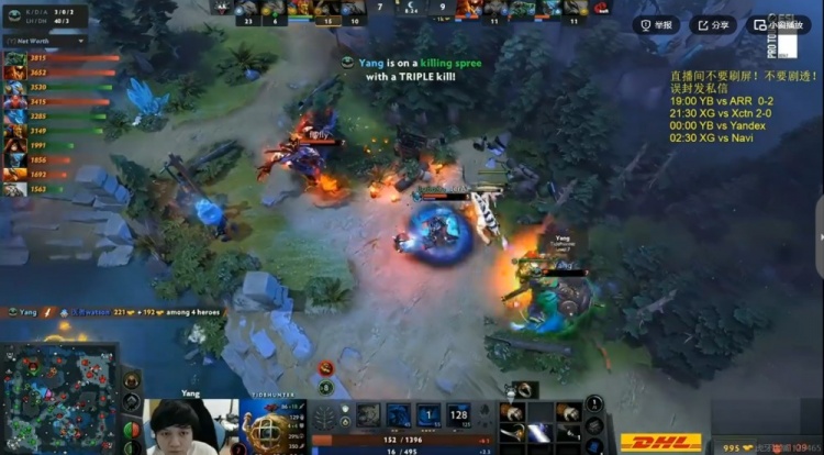 开局Yandex三人包上打了天命的凤凰一个TP死,6分钟YB上路追击过深,结果被Noticed蝙蝠骑士反打了一波0换3,Noticed蝙蝠三杀!8分钟河道团虽然MooN女王大被海民雪球躲了,但是Yang潮汐能抗能打,踩大击飞三个配合支援的flyfly影魔打出2换4!Yang潮汐三杀!