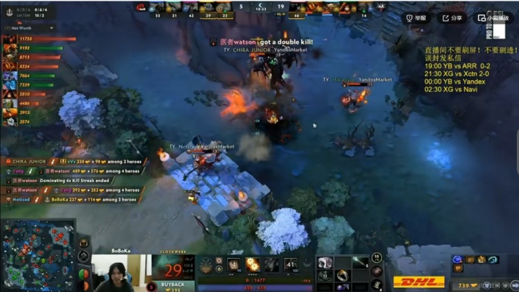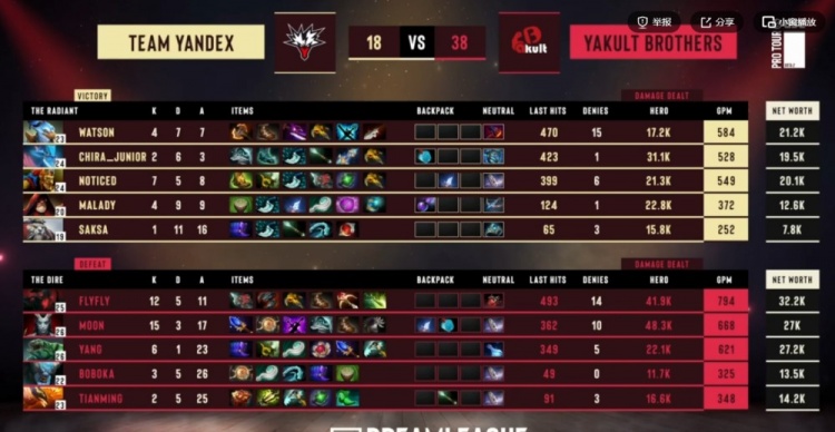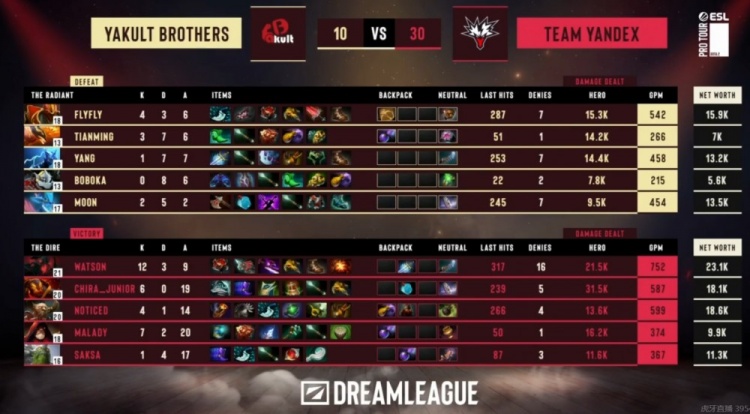 YB赢下一级团之后对线连续被针对,Yang剃刀连续被击杀之后经济掉到了第六位,Yandex仅仅12分钟就累积到了4K的经济领先!15分钟watson影魔摇大配合队友先击杀MooN拉席克,随后Yang剃刀还想守二塔直接被CHIRA_JUNIOR火猫强开!这波Yandex相当于打出0换3!随后Yandex开打肉山,Maladych术士砸大+链接AOE伤害拉满!YB倾尽全力也只击杀对手两人,被Yandex最终完成团灭!CHIRA_JUNIOR火猫带盾!