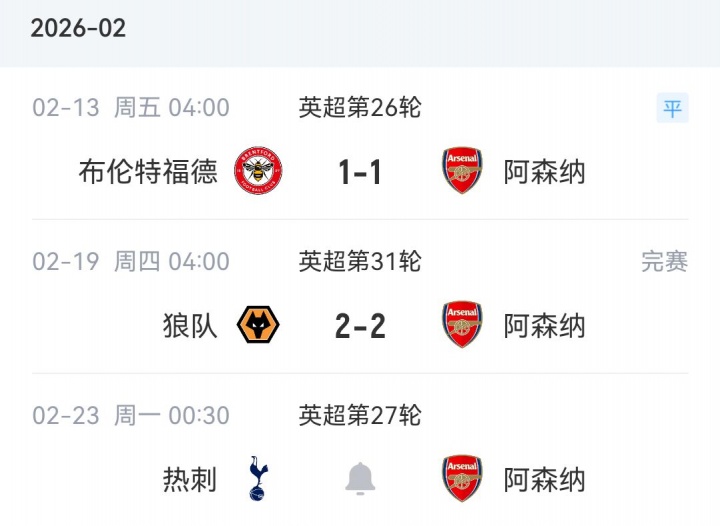 张起床 2026-02-19 07:44 两平之后接着最重要的北伦敦德比输球拉一坨大的,然后一溃到底,喜提亚军。现在发现一个问题,阿尔特塔的进攻套路或者进攻风格到底是啥?这是个问号,踢到哪算哪,实在不行稳住防守靠定位球蒙一个。