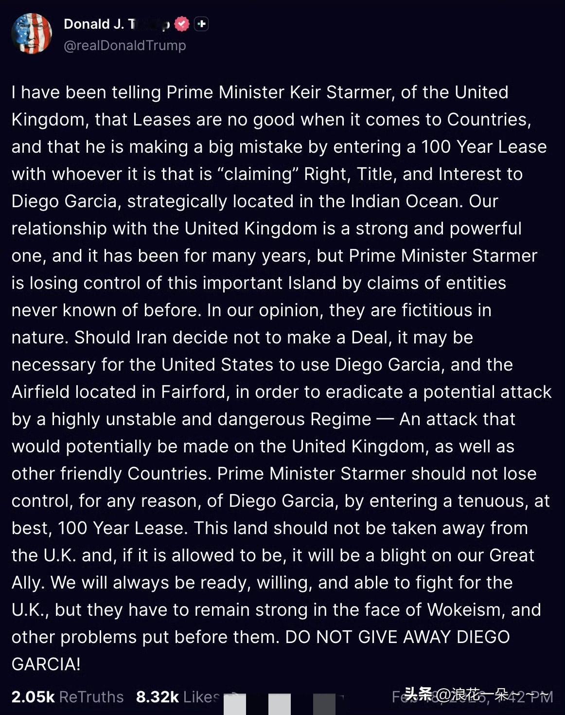 最新消息! 特朗普针对伊朗又发表了新的看法! 当然,这次也把英国首相斯塔默给扯了进来。我看特朗普的意思也很明确了,可能就是跟英国首相斯塔默说要继续使用在迪戈加西亚岛的英美军事基地打击伊朗。毕竟,每一次美国在中东的战斗几乎离不开这个岛上的军事基地上的B—2隐形战斗机。 当然,特朗普还有另外一层意思,就是提醒英国,如果美国从这个岛对伊朗发动军事打击的话,英国在中东的军事基地可能会面临伊朗的威胁和打击。所以他跟斯塔默说他也是在为英国这个盟友而战。[捂脸]