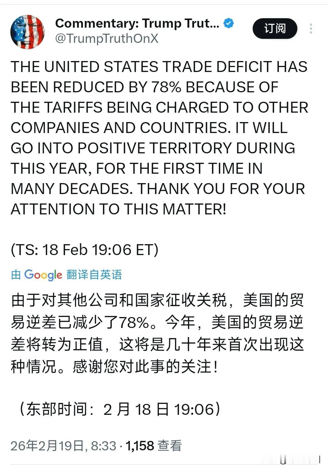 特朗普今天(北京时间2月19日)发文写道:“由于对其他公司和国家征收关税,美国的贸易逆差已减少了78%。今年,美国的贸易逆差将转为正值,这将是几十年来首次出现这种情况。感谢您对此事的关注!” 评几句: 特朗普宣称靠关税让美国贸易逆差大降78%,今年更要转为正值——这番表态听起来十分惊人,却很难经得起现实与常识的推敲。 美国贸易逆差本质是国内储蓄、消费与产业结构长期形成的结果,绝非单边关税就能轻易扭转。从实际效果来看,加征关税不仅没有真正解决贸易失衡问题,反而推高国内生产成本,扰乱全球经贸秩序。 经济运行自有其客观规律,不是靠单方面表态就能随意改写。再亮眼的目标,也要符合现实逻辑;再响亮的口号,终究要接受事实检验。 国际经贸从来不是数字游戏,尊重规律、务实合作,才是长久之道。特朗普这番“逆差转正”的表态,你觉得能实现吗?评论区一起聊聊!
