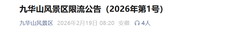 新春快乐!九华山风景区2月19日(正月初三)门票预约数量已接近单日最大游客承载量。按照“限量、预约、错峰”要求,将启动临时限流措施。