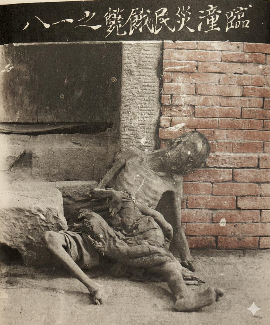 民国时期,陕西大旱。这张照片的标题是“臨潼災民餓斃之一八”,意为“临潼灾民饿死的第十八例(或第十八位记录在案的饿死者)”。这只是被记录下来的第十八位饿死者,而未被记录的悲剧更是不计其数。 画面中,一个瘦骨嶙峋的灾民倒在砖墙根下,衣衫褴褛、肢体扭曲,皮肤干瘪得紧紧贴在突出的骨头上,已经失去了生命体征。这不是艺术化的表达,而是1928—1930年陕西大旱期间,临潼县灾情的真实记录。 这场旱灾席卷陕西、甘肃等西北省份,持续三年,粮食绝收,树皮被啃尽,“人相食”的记载屡见于地方志。作为关中平原的重要县份,临潼在此次灾荒中受灾极重,饿殍遍野,这张照片是当时的纪实影像,被用来向外界传递灾情、呼吁赈济,它像一把冰冷的刀,剖开了近代中国在自然灾害与社会动荡双重压迫下,底层民众的生存绝境。 这张照片的价值,在于它没有美化、没有修饰,只留下了最残酷的真实——在那个年代,“饿死”不是遥远的新闻,而是每天都在街头、田埂、墙根上演的日常。